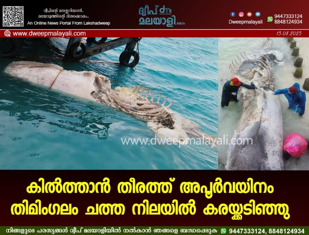 കിൽത്താൻ: കിൽത്താൻ ദ്വീപിന്റെ തീരത്ത് അപൂർവയിനം തിമിംഗലം ചത്ത നിലയിൽ കണ്ടെത്തി. ഏകദേശം എട്ട് മീറ്ററോളം നീളമുള്ള ഈ തിമിംഗലം, 20,000 കിലോമീറ്റർ വരെ സഞ്ചരിക്കുന്ന ഇനത്തിൽപ്പെട്ടതാണെന്ന് തിരിച്ചറിഞ്ഞിട്ടുണ്ട്. തിമിംഗലത്തിന്റെ വാൽ മുറിഞ്ഞ നിലയിൽ മറ്റൊരു സ്ഥലത്ത് അടിഞ്ഞുകൂടിയ നിലയിലാണ് കണ്ടെത്തിയത്.