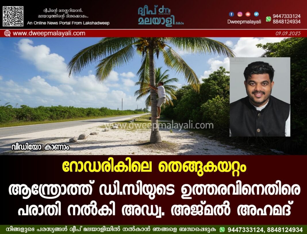 ആന്ത്രോത്ത്: പ്രാദേശിക തൊഴിലാളികൾ തെങ്ങ് കയറുന്നത് സംബന്ധിച്ച് ആന്ത്രോത്ത് ഡി സി പുറപ്പെടുവിച്ച പുതിയ ഉത്തരവിനെതിരെ പരാതി നൽകി അഡ്വ. അജ്മൽ അഹമദ്. ലക്ഷദ്വീപ് നിവാസികളുടെ പ്രധാന ഉപജീവന മാർഗങ്ങളിൽ ഒന്നാണ് തെങ്ങ് കയറ്റം. അതിന് ഇതുവരെ ഇല്ലാത്തതും സാധാരണക്കാർക്ക് എളുപ്പത്തിൽ ചെയ്യാൻ സാധിക്കാത്തതുമായ കർശന നിയന്ത്രണങ്ങൾ ഏർപ്പെടുത്തിയത് ശരിയായ നടപടിഅല്ല എന്ന് അഡ്വ. അജ്മൽ തന്റെ പരാതിയിൽ പറയുന്നു.