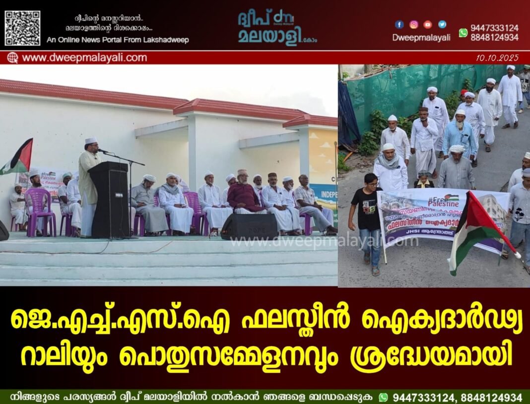 ആന്ത്രോത്ത്: സയണിസ്റ്റ് ഭീകരതയുടെ ഇരകളായ ഫലസ്തീൻ ജനതക്ക് ഐക്യദാർഢ്യം പ്രഖ്യാപിച്ചുകൊണ്ട്, ജെ.എച്ച്.എസ്.ഐയുടെ (JHSI) ആഭിമുഖ്യത്തിൽ ആന്ത്രോത്തിൽ ഫലസ്തീൻ ഐക്യദാർഢ്യ റാലിയും പൊതുസമ്മേളനവും സംഘടിപ്പിച്ചു. സമാധാനപരമായ അന്തരീക്ഷത്തിൽ നടന്ന പരിപാടിയിൽ നിരവധി പേർ പങ്കെടുത്തു.