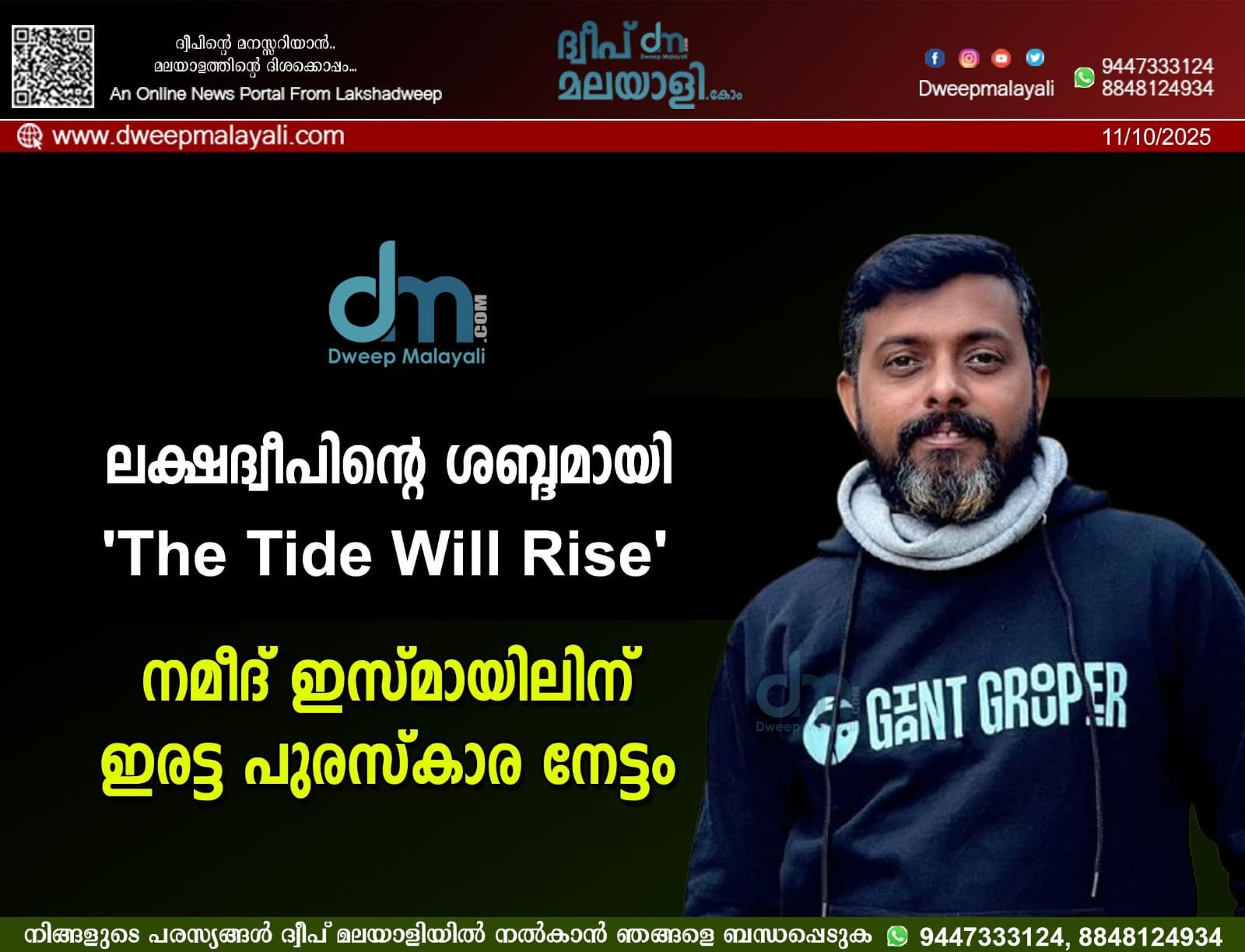 കവരത്തി: ലക്ഷദ്വീപിന്റെ സാമൂഹിക, രാഷ്ട്രീയ, സാമ്പത്തിക യാഥാർത്ഥ്യങ്ങളെ അക്ഷരങ്ങളിലേക്ക് പകർത്തിയ എഴുത്തുകാരൻ നമീദ് ഇസ്മായിൽ രചിച്ച ‘The Tide Will Rise’ എന്ന നോവലിന് 11-ാമത് ഇന്റർനാഷണൽ ലിറ്റററി അവാർഡ്സിൽ (International Literary Awards) ഇരട്ട പുരസ്കാരം. ഫിക്ഷൻ വിഭാഗത്തിലെ അംഗീകാരത്തിന് പുറമെ, ‘The Dickens Medal for Literary Excellence’ എന്ന പുരസ്കാരവും ഈ നോവൽ സ്വന്തമാക്കി.