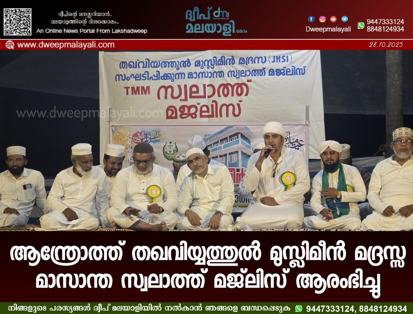 ആന്ത്രോത്ത്: ആന്ത്രോത്ത് തഖവിയത്തുൽ മുസ്ലിമീൻ മദ്രസയുടെ (TMM) ആഭിമുഖ്യത്തിൽ മാസാന്ത സ്വലാത്ത് മജ്ലിസ് ആരംഭിച്ചു. മദ്രസ വിദ്യാർത്ഥികൾക്കും രക്ഷിതാക്കൾക്കും ഉൾപ്പെടെ മുഴുവൻ വിശ്വാസികൾക്കും ആത്മീയ ഉണർവ് നൽകാനാണ് മജ്ലിസ് ലക്ഷ്യമിടുന്നത്.