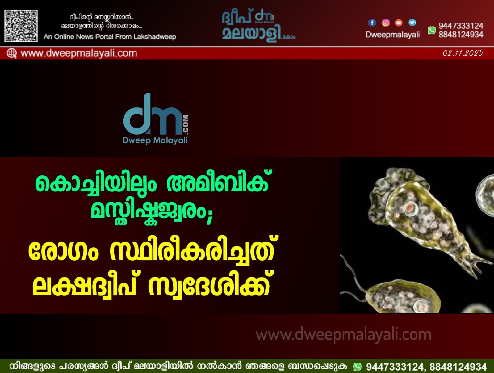 കൊച്ചി: കൊച്ചിയിലും അമീബിക് മസ്തിഷ്കജ്വരം സ്ഥിരീകരിച്ചു. ഇടപ്പള്ളിയിൽ താമസിക്കുന്ന ലക്ഷദ്വീപ് സ്വദേശിക്കാണ് രോഗബാധ. സാമ്പിൾ വിദഗ്ധ പരിശോധനയ്ക്ക് അയച്ചു. രോഗി നിലവിൽ സ്വകാര്യ ആശുപത്രിയിൽ ചികിത്സയിലാണ്. സംസ്ഥാനത്ത് വലിയ ആശങ്കയാണ് അമീബിക് മസ്തിഷ്ക ജ്വരം സൃഷ്ടിക്കുന്നത്. ആരോഗ്യവകുപ്പ് വലിയ പ്രതിരോധ പ്രവർത്തനങ്ങൾ നടത്തുന്നുണ്ടെങ്കിലും മരണനിരക്ക് വർധിക്കുന്നത് ആശങ്ക ഉണ്ടാക്കുന്നുണ്ട്. കെട്ടിക്കിടക്കുന്ന വെള്ളത്തിൽ മുങ്ങിക്കുളിക്കുന്നവരിലും നീന്തുന്നവരിലും വളരെ അപൂർവമായി ഉണ്ടാകുന്ന രോഗബാധയാണ് അമീബിക് മസ്തിഷ്‌ക ജ്വരം. 97 ശതമാനത്തിലധികം മരണനിരക്കുള്ള രോഗമാണിത്. കഴിഞ്ഞമാസം 65 പേർക്കാണ് രോഗബാധ റിപ്പോർട്ട് ചെയ്തത്.സംസ്ഥാനത്ത് ഈ വർഷം ഇതുവരെ രോഗം ബാധിച്ചു മരിച്ചവരുടെ എണ്ണം 33 ആയി. പല കേസുകളിലും രോഗബാധയുടെ ഉറവിടം കണ്ടെത്താൻ കഴിഞ്ഞിട്ടില്ല.