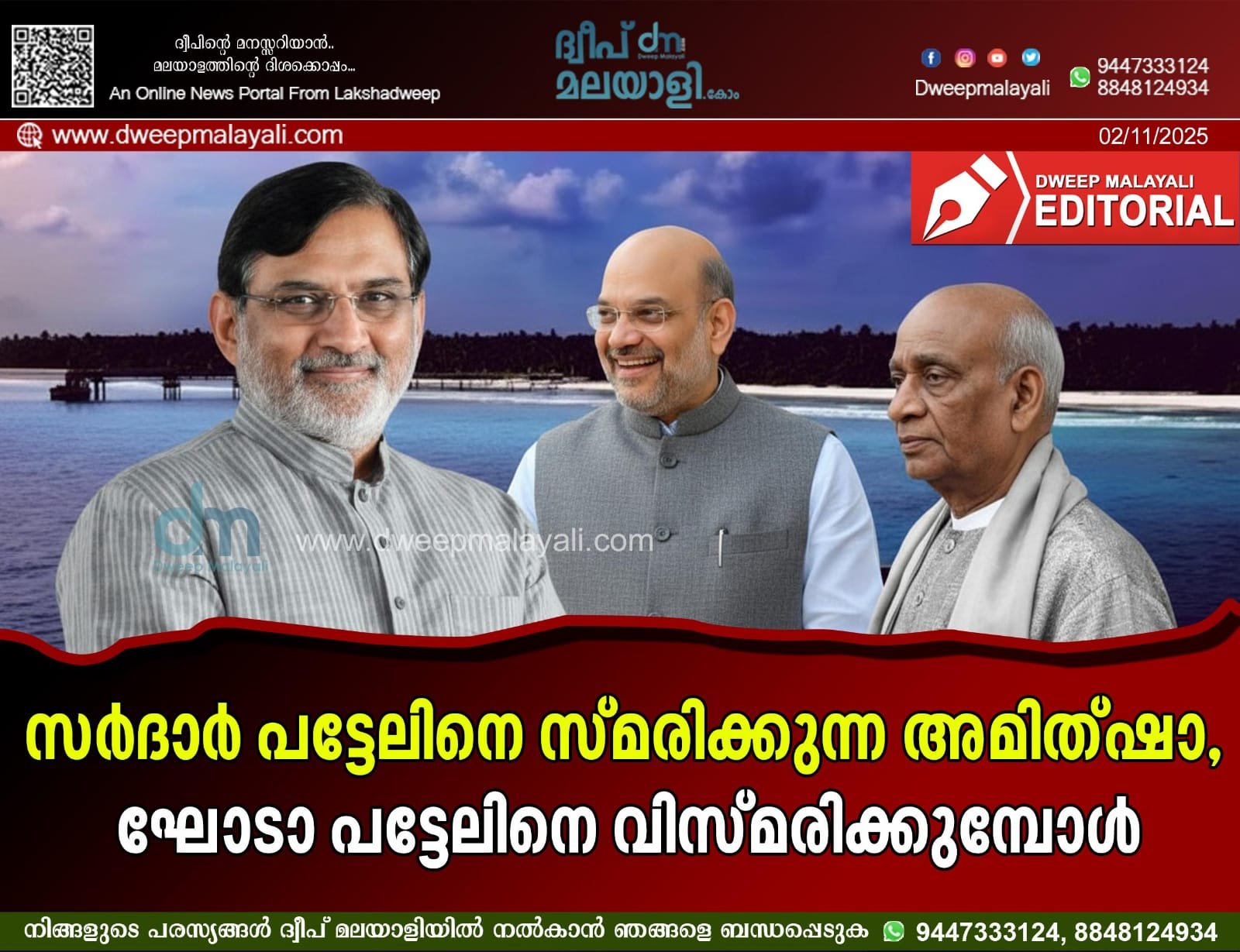 ലക്ഷദ്വീപിനെ ഇന്ത്യാ മഹാരാജ്യത്തോട് ചേർത്തു നിർത്തുന്നതിൽ ധീരമായ നിലപാടെടുത്ത സർദാർ വല്ലഭായി പട്ടേലിൻ്റെ ഓർമ്മകൾ അയവിറക്കുന്ന കേന്ദ്ര ആഭ്യന്തരമന്ത്രി അമിത്ഷാ, അവർ തന്നെ ലക്ഷദ്വീപിലേക്ക് പറഞ്ഞയച്ച പ്രഫുൽ ഘോഡാ പട്ടേലിനെ വിസ്മരിക്കുകയാണ്. ലക്ഷദ്വീപ് എന്ന വാക്ക് ഉച്ചരിക്കുമ്പോഴെല്ലാം, അഞ്ചു വർഷം കൊണ്ട് ലക്ഷദ്വീപിലെ സാധാരണക്കാരായ ജനങ്ങളുടെ ജീവിതനിലവാരം ഇടിച്ചു താഴ്ത്തിയ പ്രഫുൽ ഘോഡാ പട്ടേൽ എന്ന അഡ്മിനിസ്ട്രേറ്ററെ കൂടി കേന്ദ്ര ഭരണ പ്രദേശങ്ങളുടെ ചുമതല കൂടി വഹിക്കുന്ന അമിത്ഷാ എന്ന ആഭ്യന്തരമന്ത്രി ഓർക്കണമായിരുന്നു. നിങ്ങൾ ചെങ്കോലും കിരീടവും നൽകി ലക്ഷദ്വീപിലേക്ക് പറഞ്ഞയച്ച പുതിയ പട്ടേൽ ഇവിടുത്തെ ജനങ്ങളോട് കാണിക്കുന്ന മനുഷ്യത്വരഹിതമായ ഏകാധിപത്യ ഭരണം കൂടി രാജ്യത്തിൻ്റെ ആഭ്യന്തര മന്ത്രിയായ അങ്ങ് മനസ്സിലാക്കാൻ ശ്രമിക്കണം. സർദാർ വല്ലഭായി പട്ടേൽ ഞങ്ങളെ ഇന്ത്യാ മഹാരാജ്യത്തോട് ചേർത്തു നിർത്തിയത് ഞങ്ങൾക്ക് കൂടി അഭിമാനത്തോടെ ജീവിക്കാനുള്ള അർഹത ലഭിക്കാനാണ്. അത് ഹനിക്കുന്ന ഭരണാധികാരിയെ തിരിച്ചു വിളിച്ചു കൊണ്ട് ലക്ഷദ്വീപിലെ ജനങ്ങളോടും സർദാർ വല്ലഭായി പട്ടേലിനോടും നീതി പുലർത്താൻ ബാധ്യതയുണ്ടെന്ന് സ്വയം തിരിച്ചറിയാൻ രാജ്യത്തിൻ്റെ ആഭ്യന്തര മന്ത്രിക്ക് സാധിക്കട്ടെ.