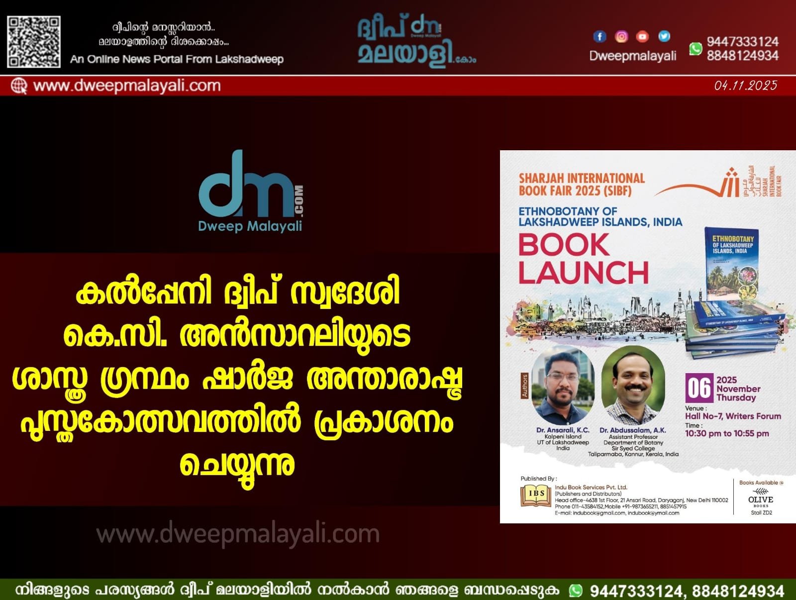 ഷാർജ: അന്താരാഷ്ട്ര പുസ്തകോത്സവത്തിൽ ലക്ഷദ്വീപിന്റെ ജൈവവൈവിധ്യത്തെയും തദ്ദേശീയമായ പാരമ്പര്യ അറിവുകളെയും ലോകത്തിന് മുന്നിൽ സമർപ്പിച്ചുകൊണ്ട് ഒരു ശാസ്ത്ര ഇംഗ്ലീഷ് പുസ്തകം പ്രകാശനം ചെയ്യും. കൽപേനി ദ്വീപ് സ്വദേശിയും പരിസ്ഥിതി പ്രവർത്തകനും അധ്യാപകനുമായ കെ.സി. അൻസാറലിയുടെയും, തളിപ്പറമ്പ് സർസയ്യിദ് കോളേജ് സസ്യശാസ്ത്ര വിഭാഗം അസിസ്റ്റന്റ് പ്രൊഫസറായ ഡോ. എ.കെ. അബ്ദുൽ സലാമിന്റെയും ‘എത്തനോബോട്ടണി ഓഫ് ലക്ഷദ്വീപ്’ (Ethnobotany of Lakshadweep) എന്ന ഗ്രന്ഥമാണ് ലോകശ്രദ്ധ നേടുന്നത്. ലക്ഷദ്വീപിന്റെ സസ്യവൈവിധ്യങ്ങളെയും പാരമ്പര്യ അറിവുകളെയും കുറിച്ച് ദീർഘകാലം നടത്തിയ പഠനത്തിലൂടെ ഡോക്ടറേറ്റ് നേടിയ അൻസാറലി, സർസയ്യിദ് കോളേജിൽ നിന്ന് ഡോക്ടറേറ്റ് നേടുന്ന ദ്വീപിൽ നിന്നുള്ള ആദ്യ പൂർവ വിദ്യാർത്ഥി കൂടിയാണ്. കണ്ണൂർ, ഭാരതീയാർ സർവകലാശാലകളിലെ ഗവേഷക ഗൈഡാണ് സഹ-രചയിതാവായ ഡോ. എ.കെ. അബ്ദുൽ സലാം. ലക്ഷദ്വീപിന്റെ ജൈവ വൈവിധ്യം, പാരമ്പര്യ വൈദ്യത്തിൽ സസ്യങ്ങളുടെ ഉപയോഗം, നാട്ടറിവുകളുടെ വിവരശേഖരം, സസ്യങ്ങളുടെ ശാസ്ത്രീയ വർഗ്ഗീകരണം, ആയുർവേദ സസ്യങ്ങളുടെ ആന്തരിക, രസതന്ത്ര പഠനം തുടങ്ങി വിവിധ മേഖലകൾ കോർത്തിണക്കിയാണ് ഈ പുസ്തകം തയ്യാറാക്കിയിരിക്കുന്നത്. നവംബർ 6-ന് വൈകുന്നേരം ഷാർജ പുസ്തകോത്സവത്തിലെ റൈറ്റേഴ്‌സ് ഫോറം ഹാളിൽ വെച്ച് യു.എ.ഇയിലെ പ്രശസ്ത എഴുത്തുകാരിയും പരിസ്ഥിതി ശാസ്ത്രജ്ഞയുമായ മറിയം അൽ ഷെനാസിയാണ് പുസ്തകം പ്രകാശനം ചെയ്യുന്നത്. നിലനിൽക്കുന്ന കാലാവസ്ഥാ വ്യതിയാനവും ദ്വീപിൽ നടപ്പാക്കുന്ന പുതിയ വികസന പ്രവർത്തനങ്ങളും പരമ്പരാഗത സസ്യസമ്പത്തിനെ സമീപഭാവിയിൽ പൂർണമായും ഇല്ലാതാക്കുമെന്ന് പഠനം മുന്നറിയിപ്പ് നൽകുന്നുണ്ട്, അതോടൊപ്പം അത്യപൂർവമായ സസ്യസമ്പത്തിൻ്റെ സംരക്ഷണത്തിനും ഗവേഷണ പ്രവർത്തനങ്ങൾ തുടരുന്നതിൻ്റെ ആവശ്യകതയും പുസ്തകം ശക്തമായി ശുപാർശ ചെയ്യുന്നു. കൂടാതെ, ദ്വീപിന്റെ സസ്യ വൈവിധ്യങ്ങളെയും പ്രകൃതിയേയും പാരമ്പര്യങ്ങളേയും സമന്വയിപ്പിച്ചുകൊണ്ടുള്ള വിനോദസഞ്ചാരത്തിന് വലിയ സാധ്യതകളുണ്ടെന്നും പഠനം ചൂണ്ടിക്കാട്ടുന്നു. ഡൽഹിയിലെ ഇന്തു പ്രസാധകരാണ് ലക്ഷദ്വീപിൽ നിന്നുള്ള പ്രഥമ അന്താരാഷ്ട്ര ഇംഗ്ലീഷ് ശാസ്ത്ര പുസ്തകമായ ഈ ഗ്രന്ഥം ലോകമെമ്പാടുമുള്ള വായനക്കാരിലേക്ക് എത്തിക്കുന്നത്.
