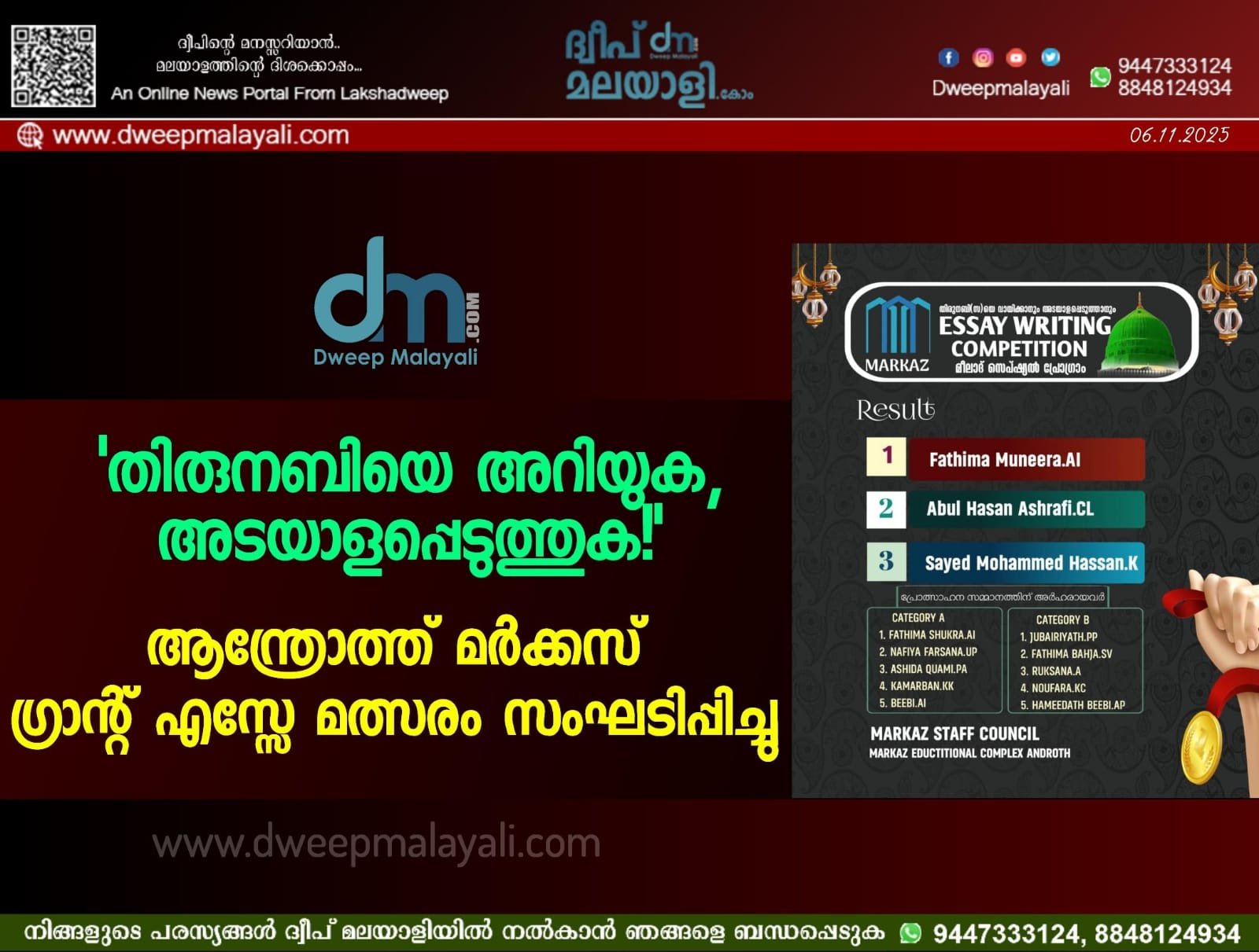 നബി തിരുമേനിയുടെ 1500-ാം ജന്മദിനത്തോടനുബന്ധിച്ച് ആന്ത്രോത്ത് മർക്കസ് സ്റ്റാഫ് കൗൺസിലാണ് മത്സരം സംഘടിപ്പിച്ചത്. യുവജനങ്ങൾക്ക് പുറമെ, മുതിർന്ന പൗരന്മാരായ പി.കെ. ശറഫുദ്ദീൻ ഹാജി, കെ.പി. കാസ്മിക്കോയ എന്നിവർ മത്സരത്തിൽ പങ്കെടുത്തത് ശ്രദ്ധേയമായി. തിരുനബിയുടെ ജീവിതത്തെ അനവധി പേജുകളിൽ അടയാളപ്പെടുത്തിക്കൊണ്ട് നിരവധി മത്സരാർത്ഥികൾ പങ്കെടുത്ത ഈ പരിപാടി, പ്രവാചക ചരിത്ര പഠനത്തിന് ഊന്നൽ നൽകി. മത്സരത്തിൽ ഫാത്തിമ മുനീറ എ.ഐ., അബുൽ ഹസൻ അഷ്റഫി സി.എൽ, സയ്യിദ് മുഹമ്മദ് ഹസ്സൻ കെ. എന്നിവർ യഥാക്രമം ഒന്ന്, രണ്ട്, മൂന്ന് സ്ഥാനങ്ങൾ നേടി. മികച്ച പ്രകടനം കാഴ്ചവെച്ച പത്തോളം സഹോദരിമാർ പ്രോത്സാഹന സമ്മാനത്തിന് അർഹരായി. ഭാവി തലമുറക്ക് പ്രവാചകരെ പഠിക്കാനും പകർത്താനും ഇത്തരം മത്സരങ്ങൾ അനിവാര്യമാണെന്ന് സംഘാടകർ അഭിപ്രായപ്പെട്ടു. വിജയികൾക്കുള്ള സമ്മാനദാനവും പങ്കെടുത്തവർക്കുള്ള സർട്ടിഫിക്കറ്റ് വിതരണവും ഈ മാസം രണ്ടാം വാരം ആന്ത്രോത്ത് മർക്കസ് ഓഡിറ്റോറിയത്തിൽ വെച്ച് നടക്കും. പ്രമുഖ പണ്ഡിതന്മാരും മർക്കസ് സാരഥികളും പൗരപ്രധാനികളും ചടങ്ങിൽ സംബന്ധിക്കുമെന്നും മർക്കസ് സ്റ്റാഫ് കൗൺസിൽ ഭാരവാഹികൾ പത്രക്കുറിപ്പിലൂടെ അറിയിച്ചു.