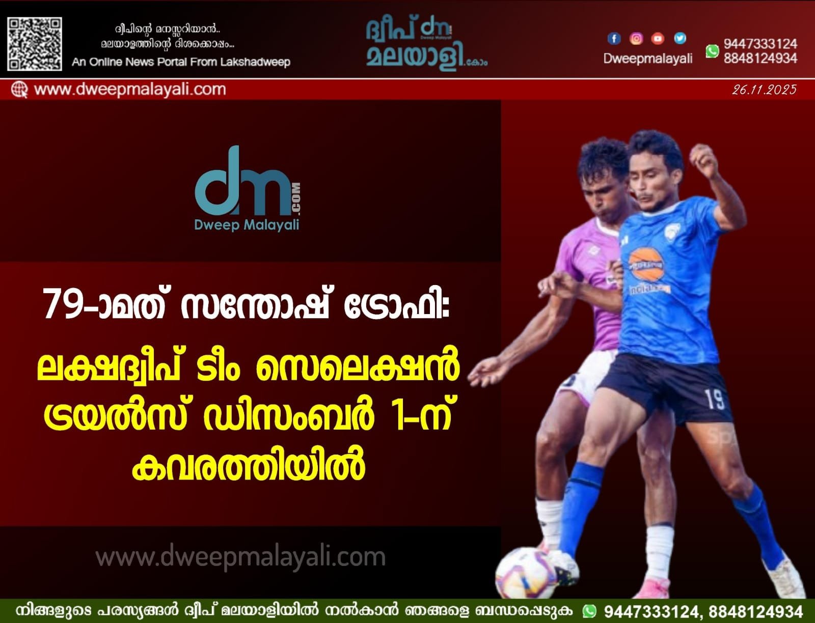 കവരത്തി: 79-ാമത് സന്തോഷ് ട്രോഫിക്കായുള്ള ലക്ഷദ്വീപ് ടീമിനെ തിരഞ്ഞെടുക്കുന്നതിനുള്ള സെലെക്ഷൻ ട്രയൽസ് ഡിസംബർ 1 ന് കവരത്തി മിനി സ്റ്റേഡിയത്തിൽ നടക്കും.