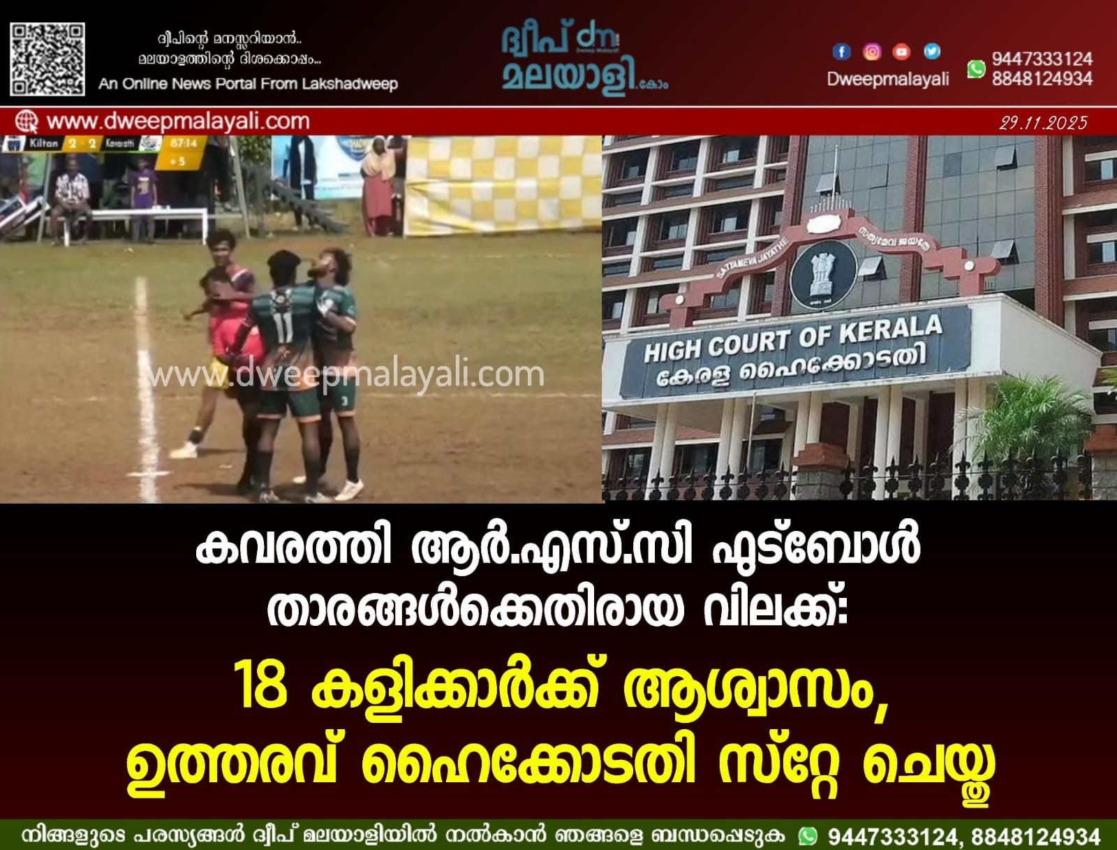 കൊച്ചി: ലക്ഷദ്വീപ് ഗെയിംസ് ഫുട്ബോൾ ടൂർണമെന്റിനിടെയുണ്ടായ സംഘർഷങ്ങളുടെ പേരിൽ കവരത്തി റീജിയണൽ സ്പോർട്സ് കൗൺസിലിലെ (ആർ.എസ്.സി.) കളിക്കാർക്കും ഒഫീഷ്യൽസിനുമെതിരെ കായിക യുവജനകാര്യ വകുപ്പ് ഏർപ്പെടുത്തിയ വിലക്കിന് കേരള ഹൈക്കോടതിയുടെ ഇടക്കാല സ്റ്റേ. കവരത്തി ആർ.എസ്.സി. ടീമിലെ 18 കളിക്കാർ സമർപ്പിച്ച ഹർജിയിലാണ് (WP(C) NO. 45185 OF 2025) ജസ്റ്റിസ് വി.ജി. അരുൺ ഉത്തരവിട്ടത്.