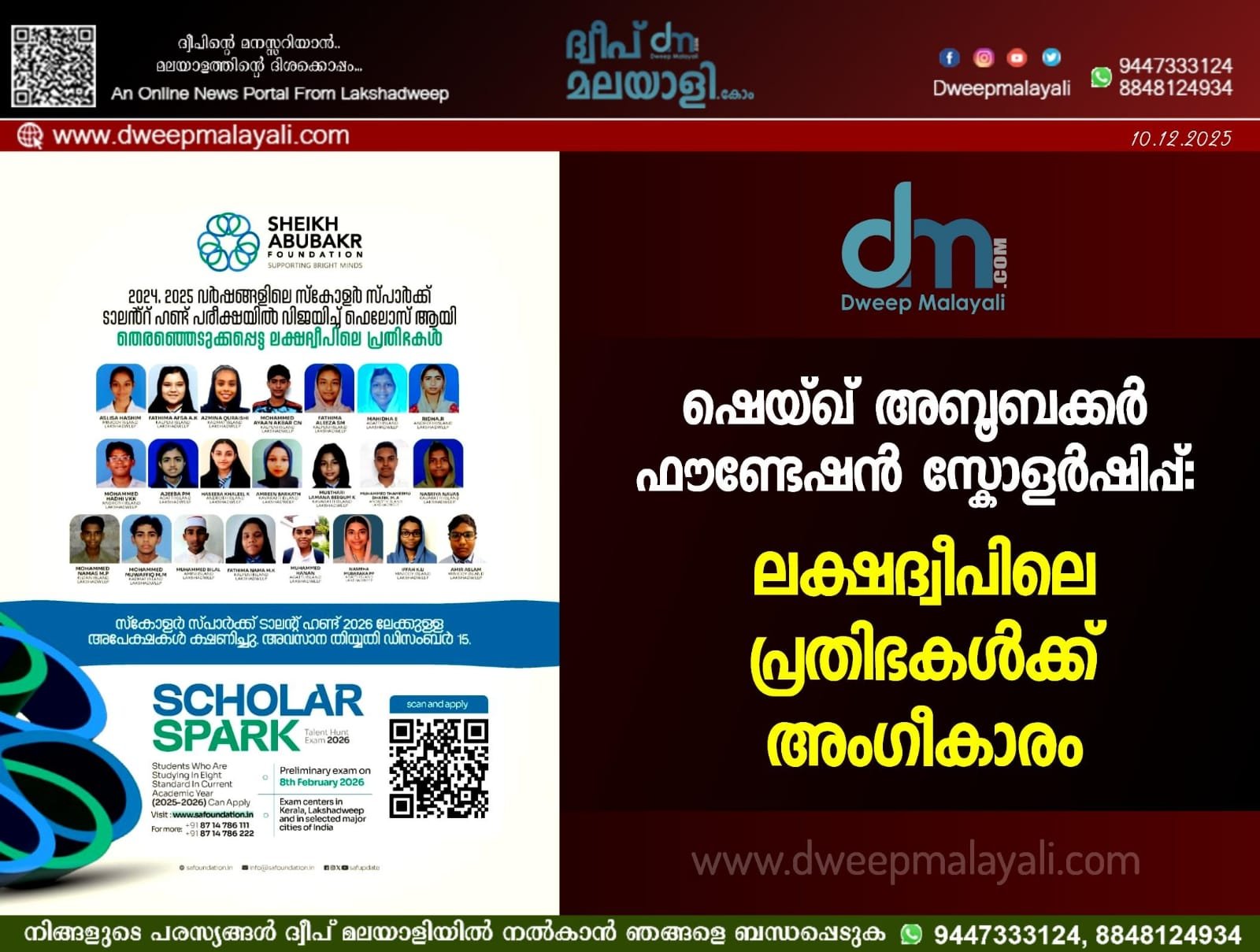 ​ലക്ഷദ്വീപിലെയും മറ്റ് പ്രദേശങ്ങളിലെയും വിദ്യാർത്ഥികൾക്കായി, അടുത്ത അധ്യയന വർഷത്തേക്കുള്ള (2025-2026) ‘സ്‌കോളർ സ്പാർക്ക്’ ടാലന്റ് ഹണ്ട് പരീക്ഷയ്ക്ക് ഫൗണ്ടേഷൻ അപേക്ഷകൾ ക്ഷണിച്ചു.