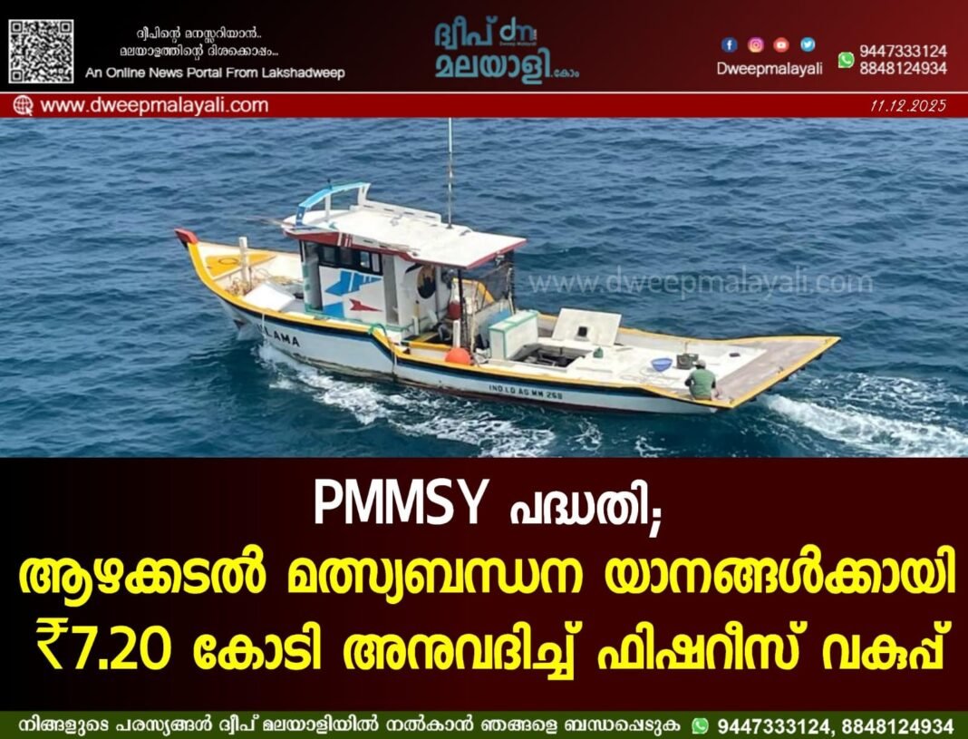 കവരത്തി: പ്രധാനമന്ത്രി മത്സ്യ സമ്പാദ യോജന (PMMSY) പദ്ധതിയുടെ ഭാഗമായി, പരമ്പരാഗത മത്സ്യത്തൊഴിലാളികൾക്ക് ആഴക്കടൽ മത്സ്യബന്ധന യാനങ്ങൾ വാങ്ങാൻ പിന്തുണ നൽകുന്നതിനായി ലക്ഷദ്വീപ് ഭരണകൂടത്തിലെ ഫിഷറീസ് ഡയറക്ടറേറ്റ് ₹7,20,00,000/- (ഏഴ് കോടി ഇരുപത് ലക്ഷം രൂപ) അനുവദിച്ചു. പത്ത് (10) ഗുണഭോക്താക്കൾക്കായി, ഓരോരുത്തർക്കും ഒരു ഫൈബർ റീഇൻഫോഴ്‌സ്‌ഡ് പ്ലാസ്റ്റിക് (FRP) പോൾ ആൻഡ് ലൈൻ കം ലോങ് ലൈനർ ആഴക്കടൽ മത്സ്യബന്ധന യാനം നിർമ്മിക്കുന്നതിനുള്ള കേന്ദ്ര വിഹിതമായാണ് (60%) ഈ തുക അനുവദിച്ചിട്ടുള്ളത്. അനുവദിച്ച ഈ തുക, ഡിസ്ട്രിക്റ്റ് ലെവൽ കമ്മിറ്റി, PMMSY-യുടെ ജോയിന്റ് അക്കൗണ്ടിൽ (UCO ബാങ്ക്) നിന്ന് പിൻവലിച്ച ശേഷം, ഗുണഭോക്താക്കൾ, വകുപ്പ്, ബാങ്ക് എന്നിവർ സംയുക്തമായി പ്രവർത്തിപ്പിക്കുന്ന എസ്‌ക്രോ ബാങ്ക് അക്കൗണ്ടുകളിലേക്ക് (SBI, കവരത്തി ബ്രാഞ്ച്) ക്രെഡിറ്റ് ചെയ്യും. ത്രികക്ഷി കരാർ വ്യവസ്ഥകളും PMMSY മാർഗ്ഗനിർദ്ദേശങ്ങളും അനുസരിച്ച്, ബോട്ട് നിർമ്മാണ യാർഡിന് ഡയറക്ട് ബെനിഫിറ്റ് ട്രാൻസ്ഫർ (DBT) മോഡ് വഴി ഘട്ടം ഘട്ടമായി തുക കൈമാറുന്നതാണ്. ലക്ഷദ്വീപ് അഡ്മിനിസ്ട്രേറ്ററുടെ ഉപദേഷ്ടാവിന്റെ അംഗീകാരത്തോടെയാണ് ഈ സാമ്പത്തികാനുമതി നൽകിയിരിക്കുന്നത്.
