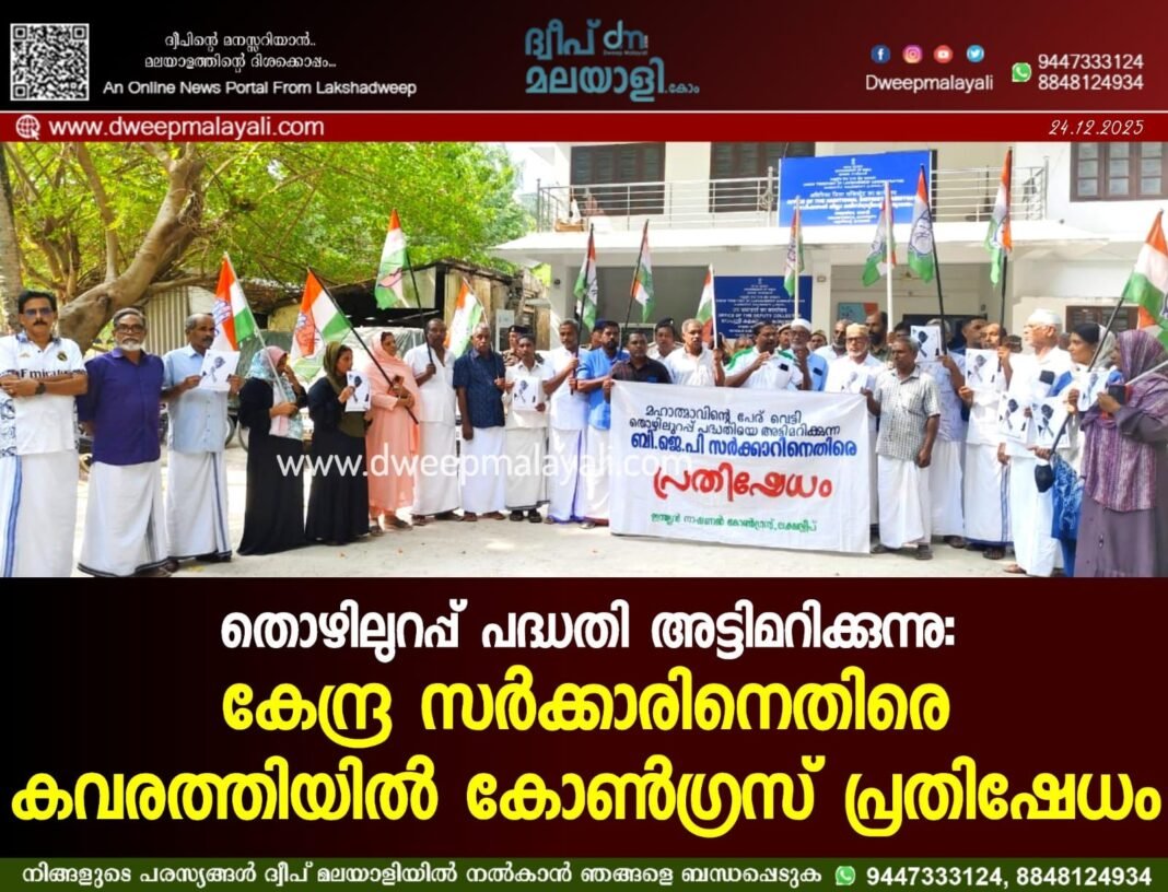 കവരത്തി: ഗ്രാമീണ ജനതയുടെ ജീവനാഡിയായ മഹാത്മാഗാന്ധി ദേശീയ ഗ്രാമീണ തൊഴിലുറപ്പ് പദ്ധതിയെ കേന്ദ്ര സർക്കാർ അട്ടിമറിക്കുന്നുവെന്ന് ആരോപിച്ച് ലക്ഷദ്വീപ് പ്രദേശ് കോൺഗ്രസ് കമ്മിറ്റിയുടെ നേതൃത്വത്തിൽ കവരത്തിയിൽ ശക്തമായ പ്രതിഷേധം സംഘടിപ്പിച്ചു. പദ്ധതിയിൽ നിന്ന് രാഷ്ട്രപിതാവിന്റെ പേര് ഒഴിവാക്കാനുള്ള നീക്കവും, ഫണ്ട് വെട്ടിക്കുറച്ച് സാധാരണക്കാരുടെ ഉപജീവനമാർഗ്ഗം തടസ്സപ്പെടുത്തുന്ന ബിജെപി സർക്കാരിന്റെ രാഷ്ട്രീയ അജണ്ടയ്ക്കുമെതിരെയായിരുന്നു പ്രതിഷേധം.