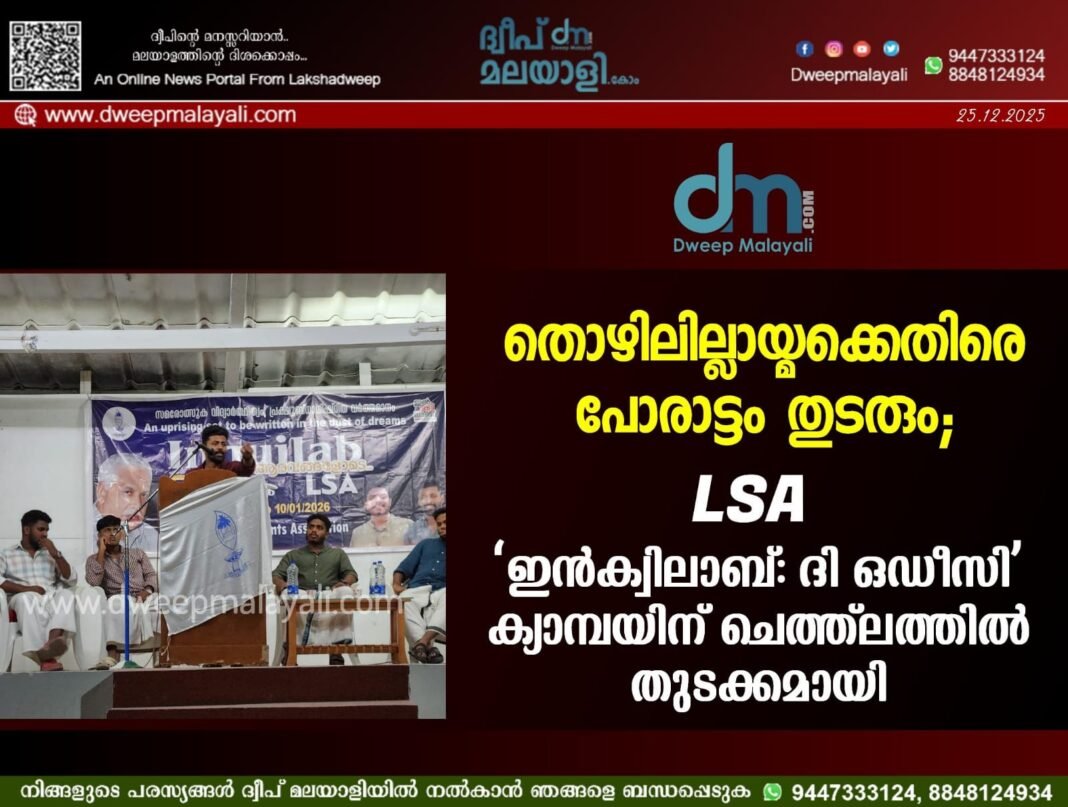 ചെത്ത്ലത്ത്: ലക്ഷദ്വീപ് സ്റ്റുഡൻസ് അസോസിയേഷൻ (LSA) കേന്ദ്ര കമ്മിറ്റി സംഘടിപ്പിക്കുന്ന ദ്വീപ് തല ക്യാമ്പയിൻ ‘ഇൻക്വിലാബ്: ദി ഒഡീസി’ (INQUILAB THE ODYSSEY) ആവേശകരമായ തുടക്കം. ഡിസംബർ 24-ന് ചെത്ത്ലത്ത് ദ്വീപിൽ വെച്ച് നടന്ന ചടങ്ങോടെയാണ് ക്യാമ്പയിന് ഔദ്യോഗികമായി തുടക്കമിട്ടത്.