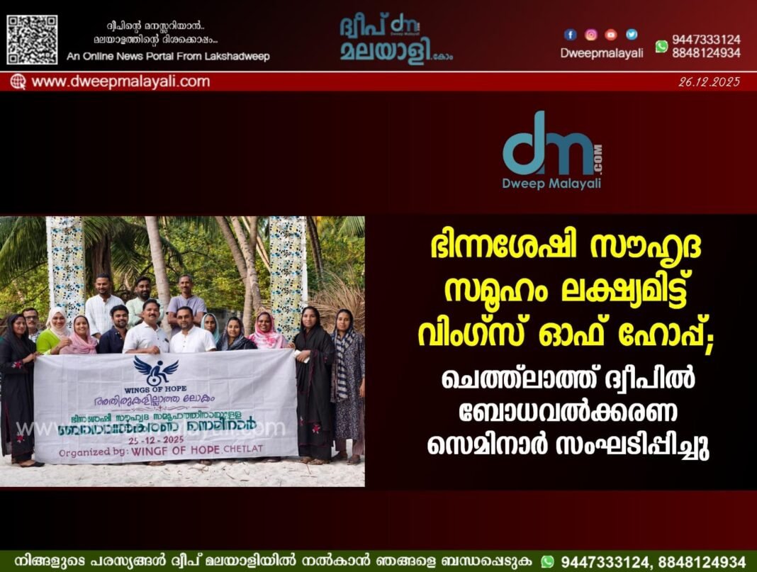 ചെത്ത്ലത്ത്: ഭിന്നശേഷി സമൂഹത്തിന് തുല്യ അവസരങ്ങളും അവകാശങ്ങളും ഉറപ്പാക്കുക, അവരെ മുഖ്യധാരയിലേക്ക് കൊണ്ടുവരിക എന്നീ ലക്ഷ്യങ്ങളോടെ പ്രവർത്തിക്കുന്ന ‘വിംഗ്സ് ഓഫ് ഹോപ്പ്’ സംഘടനയുടെ ആഭിമുഖ്യത്തിൽ പ്രഥമ ബോധവൽക്കരണ സെമിനാർ സംഘടിപ്പിച്ചു. ഡിസംബർ 25-ന് ചെത്ത്ലാത്ത് മുനവ്വിറുൽ ഇസ്ലാം മദ്രസ്സ അങ്കണത്തിൽ വെച്ച് നടന്ന പരിപാടി ബ്ലോക്ക് ഡെവലപ്മെന്റ് ഓഫീസർ ഇൻചാർജും മെഡിക്കൽ ഓഫീസറുമായ ഡോ. ദിൽഷാദ് ഖാൻ ഉദ്ഘാടനം ചെയ്തു. ഭിന്നശേഷി സൗഹൃദ സമൂഹം എന്നത് ആരുടെയെങ്കിലും ഔദാര്യമല്ല, മറിച്ച് ഓരോരുത്തരുടെയും അവകാശമാണെന്ന് അദ്ദേഹം ഉദ്ഘാടന പ്രസംഗത്തിൽ ഓർമ്മിപ്പിച്ചു.