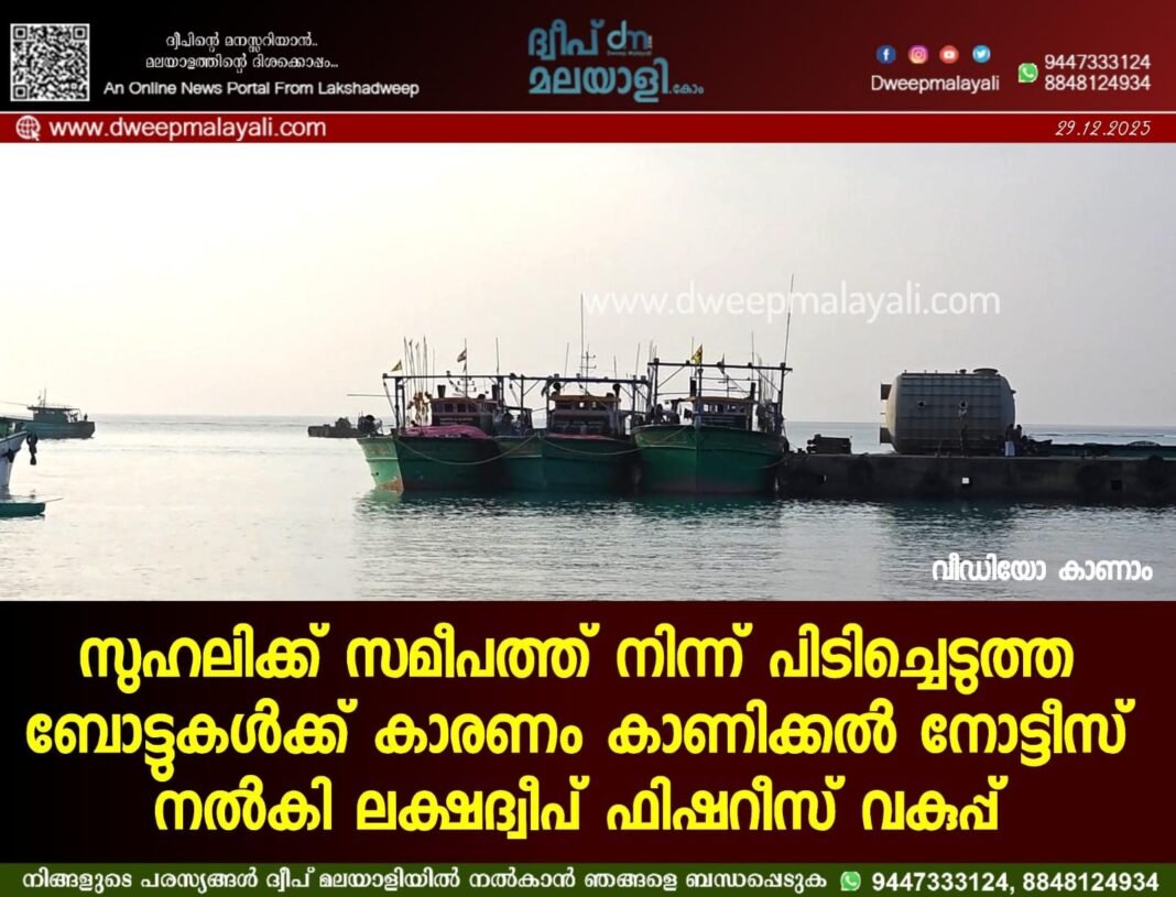 ഫിഷറീസ് ഡയറക്ടറും അഡ്ജുഡിക്കേറ്റിംഗ് ഓഫീസറുമായ കെ. ബുസാർ ജംഹർ ആണ് നോട്ടീസ് അയച്ചിരിക്കുന്നത്. LMFR 2000 പ്രകാരം ഇവർക്കെതിരെ എന്തുകൊണ്ട് നടപടി സ്വീകരിക്കരുത് എന്നതിന് 30 ദിവസത്തിനകം വിശദീകരണം നൽകാൻ നിർദ്ദേശിച്ചിട്ടുണ്ട്. കൃത്യസമയത്ത് മറുപടി നൽകാത്ത പക്ഷം ഏകപക്ഷീയമായ തീരുമാനങ്ങളുമായി അധികൃതർ മുന്നോട്ട് പോകുമെന്നും നോട്ടീസിൽ വ്യക്തമാക്കിയിട്ടുണ്ട്. മുൻപ് ബോട്ടുകളെ വെറുതെ വിട്ടയക്കാൻ നീക്കം നടക്കുന്നതായി ആരോപിച്ച് കവരത്തിയിലെ മത്സ്യത്തൊഴിലാളികൾ കടുത്ത പ്രതിഷേധത്തിലായിരുന്നു.