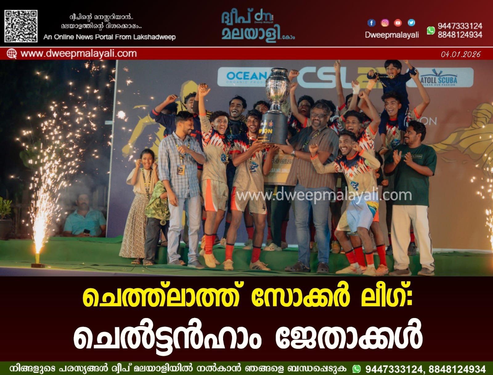 ചെത്ത്ലാത്ത്: ആവേശകരമായ ഫുട്ബോൾ പോരാട്ടങ്ങൾക്കൊടുവിൽ ഫിനിക്സ് ക്ലബ് സംഘടിപ്പിച്ച ചെത്ത്ലാത്ത് സോക്കർ ലീഗിൽ ചെൽട്ടൻഹാമിന് കിരീടം. ഫൈനലിൽ ലക്ഷദ്വീപ് എൻവയോൺമെന്റ് ആൻഡ് ഫോറസ്റ്റ് ടീമിനെ ഏകപക്ഷീയമായ ഒരു ഗോളിന് കീഴടക്കിയാണ് ചെൽട്ടൻഹാം ചാമ്പ്യന്മാരായത്. സന്തോഷ് ട്രോഫി താരം ഷാനവാസ് ഖാൻ നേടിയ തകർപ്പൻ ഗോളാണ് ചെൽട്ടൻഹാമിന് വിജയം സമ്മാനിച്ചത്.