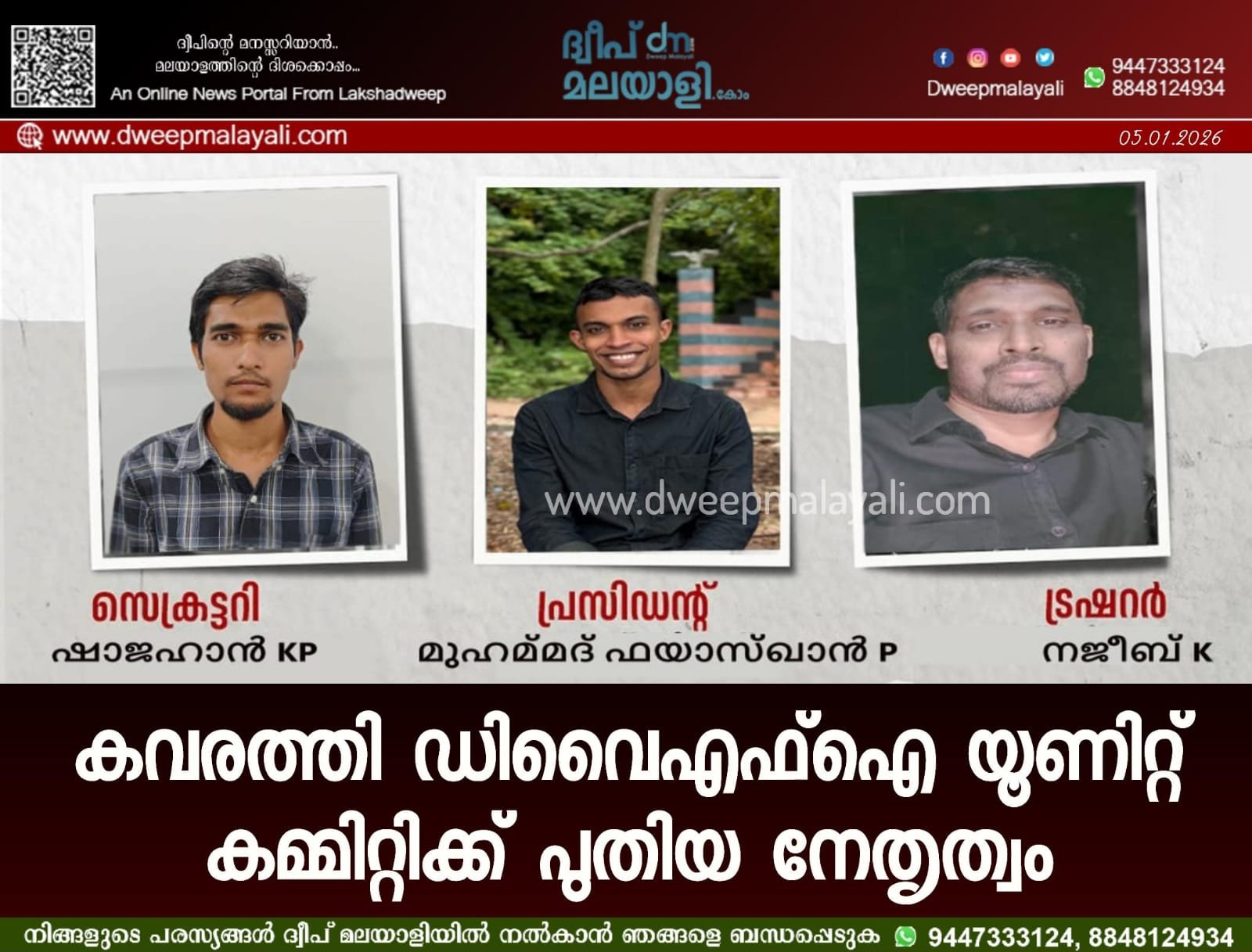 കവരത്തി: ഡിവൈഎഫ്ഐ (DYFI) കവരത്തി യൂണിറ്റ് കമ്മിറ്റിയുടെ പുതിയ ഭാരവാഹികളെ തിരഞ്ഞെടുത്തു. സംഘടനാ പ്രവർത്തനങ്ങൾ കൂടുതൽ ശക്തിപ്പെടുത്തുന്നതിന്റെ ഭാഗമായാണ് പുതിയ നേതൃത്വത്തെ പ്രഖ്യാപിച്ചത്.