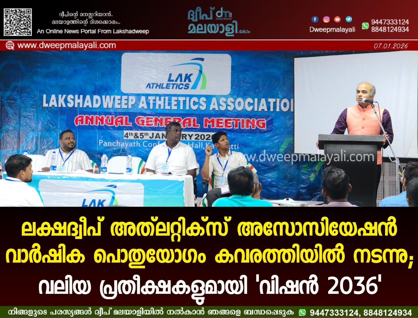 സീനിയർ വൈസ് പ്രസിഡന്റ് തങ്ങൾ കോയ സ്വാഗതം ആശംസിച്ച യോഗത്തിൽ, അസോസിയേഷൻ ഫൗണ്ടർ സെക്രട്ടറിയും അത്ലറ്റിക്സ് പരിശീലകനുമായ അഹമ്മദ് ജവാദ് ഹസൻ മുഖ്യപ്രഭാഷണം നടത്തി. ലക്ഷദ്വീപിലെ കായിക മേഖലയിൽ വലിയ മാറ്റങ്ങൾ ലക്ഷ്യമിടുന്ന ‘വിഷൻ 2036 ലക്ഷദ്വീപ് ടു ഒളിമ്പിക്സ്’ (Vision 2036 Lakshadweep to Olympics) എന്ന ദീർഘകാല പദ്ധതി അദ്ദേഹം യോഗത്തിൽ അവതരിപ്പിച്ചു. വരാനിരിക്കുന്ന ഒളിമ്പിക്സുകളിൽ ലക്ഷദ്വീപിൽ നിന്നുള്ള കായികതാരങ്ങളുടെ പങ്കാളിത്തം ഉറപ്പാക്കുക എന്ന ലക്ഷ്യത്തോടെ അവതരിപ്പിച്ച പദ്ധതി, ദ്വീപിലെ കായിക പ്രതിഭകളെ അന്താരാഷ്ട്ര നിലവാരത്തിലേക്ക് ഉയർത്താൻ സഹായിക്കുക എന്ന ലക്ഷ്യത്തോടെയാണ്. അസോസിയേഷൻ ജോയിന്റ് സെക്രട്ടറി പി. നസീർ ചടങ്ങിൽ ആശംസകൾ അർപ്പിച്ചു. സെക്രട്ടറി മുസ്നാദ് കഴിഞ്ഞ വർഷത്തെ പ്രവർത്തന റിപ്പോർട്ട് അവതരിപ്പിക്കുകയും ചടങ്ങിന് നന്ദി രേഖപ്പെടുത്തുകയും ചെയ്തു.