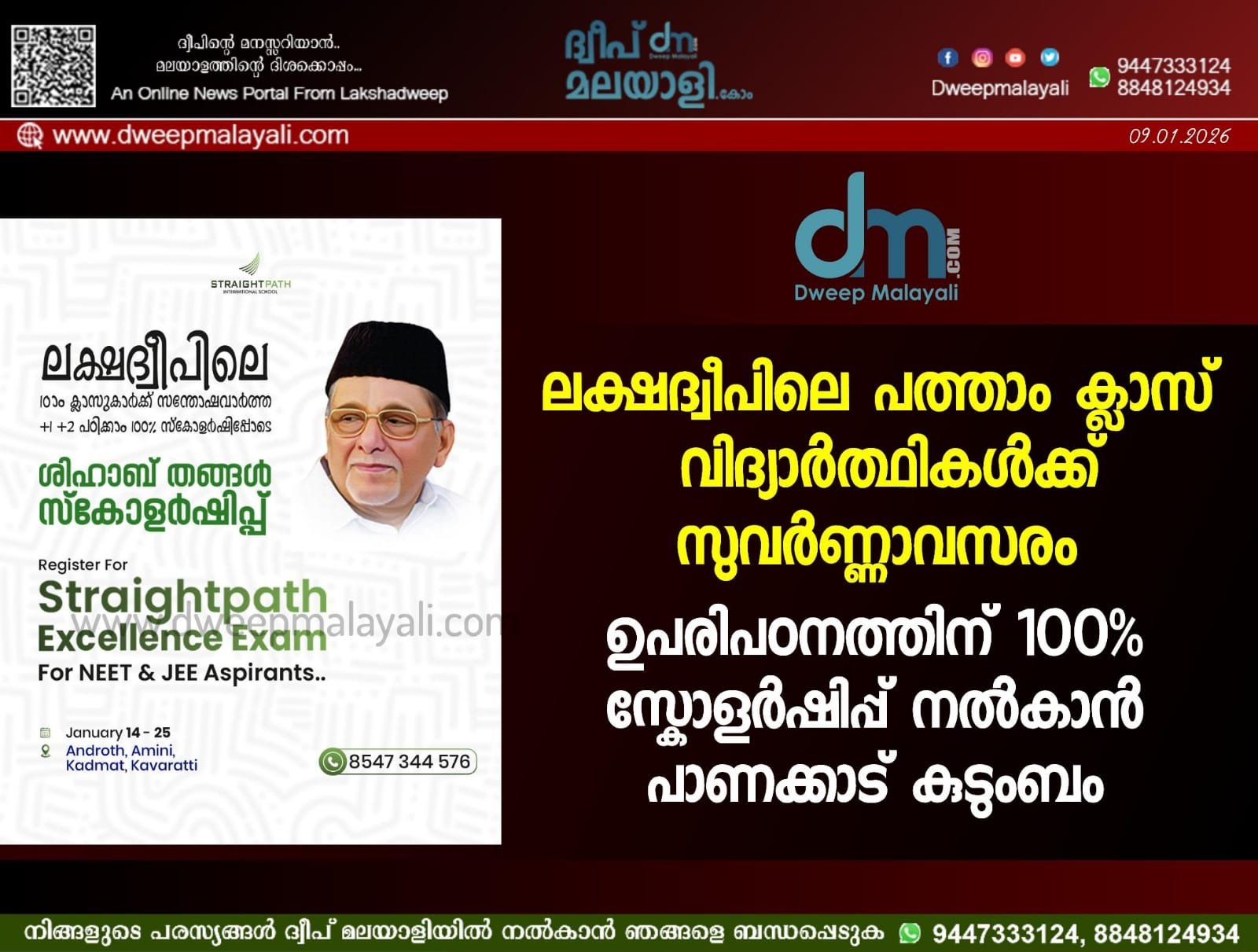 കൊച്ചി: ദ്വീപിലെ പത്താം ക്ലാസ് വിദ്യാർത്ഥികൾക്ക് ഉന്നത വിദ്യാഭ്യാസ രംഗത്ത് പുത്തൻ പ്രതീക്ഷകളുമായി പാണക്കാട് തങ്ങൾ കുടുംബം നടത്തുന്ന സ്ട്രൈറ്റ്‌പാത്ത് ഇന്റർനാഷണൽ സ്കൂൾ (Straightpath International School). പത്താം ക്ലാസ് പൂർത്തിയാക്കുന്ന മിടുക്കരായ വിദ്യാർത്ഥികൾക്ക് സയൻസ് സ്ട്രീമിൽ പ്ലസ് വൺ, പ്ലസ് ടു എൻട്രൻസ് ഇന്റഗ്രേറ്റഡ് കോഴ്സുകൾ തികച്ചും സൗജന്യമായി പഠിക്കാനുള്ള സുവർണ്ണാവസരമാണ് ഇതിലൂടെ ഒരുങ്ങുന്നത്. നൂറു ശതമാനം സ്കോളർഷിപ്പോടെയുള്ള ഈ പദ്ധതിയിലൂടെ ആദ്യ ശ്രമത്തിൽ തന്നെ നീറ്റ് (NEET), ജെ.ഇ.ഇ (JEE) തുടങ്ങിയ ദേശീയ പ്രവേശന പരീക്ഷകളിൽ ഉന്നത വിജയം കരസ്ഥമാക്കാൻ കുട്ടികളെ പ്രാപ്തരാക്കുകയാണ് ലക്ഷ്യം.