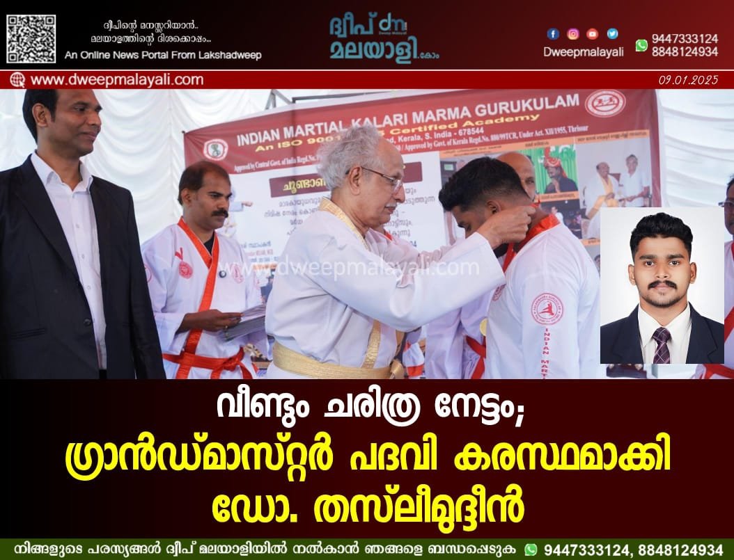 കൊച്ചി: ആയോധനകലാ രംഗത്തെ അത്യപൂർവ്വ നേട്ടമായ ഗ്രാൻഡ്മാസ്റ്റർ പദവി സ്വന്തമാക്കി കവരത്തി സ്വദേശി ഡോ. തസ്ലീമുദ്ദീൻ. പതിനൊന്നാം ഡിഗ്രി ബ്ലാക്ക് ബെൽറ്റും കടന്ന് മർമ്മ റെഡ് ബെൽറ്റ് (MRB) കരസ്ഥമാക്കിയ അദ്ദേഹം ഈ പദവിയിലെത്തുന്ന ആദ്യ ലക്ഷദ്വീപുകാരനെന്ന ചരിത്രപരമായ നാഴികക്കല്ലാണ് പിന്നിട്ടത്. മുതിർന്ന ഗ്രാൻഡ്മാസ്റ്റർ ശ്രീ. ആന്റണിയുടെ മേൽനോട്ടത്തിൽ നടന്ന ചടങ്ങിൽ വെച്ച് ഈ ഔദ്യോഗിക പദവി ഇദ്ദേഹത്തിന് നൽകി ആദരിച്ചു. അതോടൊപ്പം, ഐ.എം.എ അക്കാദമിയിൽ നിന്ന് ഗ്രാൻഡ്മാസ്റ്റർ പദവി നേടുന്ന ഏറ്റവും പ്രായം കുറഞ്ഞ വ്യക്തി എന്ന ബഹുമതിയും ഡോ. തസ്ലീമുദ്ദീൻ ഇതോടെ സ്വന്തമാക്കി.