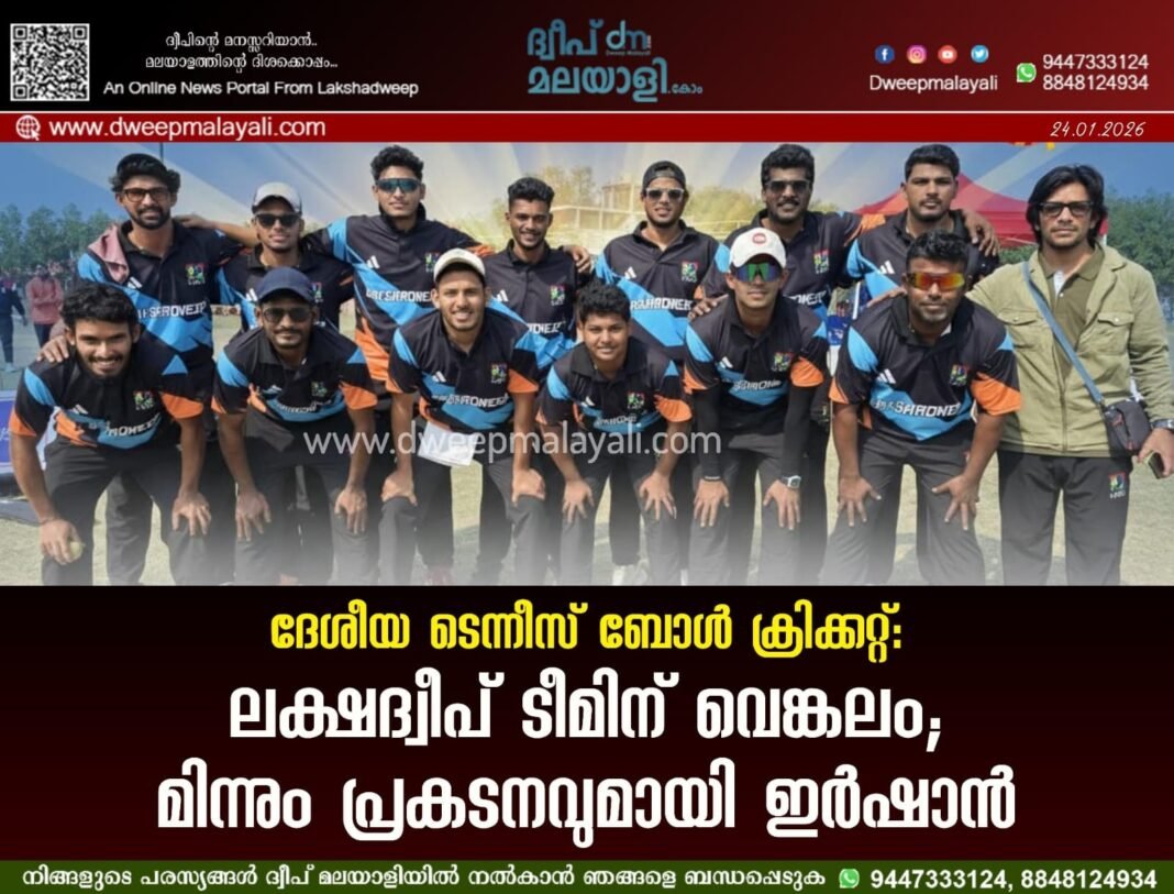 നാഗ്പൂർ: മഹാരാഷ്ട്രയിലെ നാഗ്പൂരിൽ വെച്ച് നടന്ന മുപ്പത്തിയാറാമത് ദേശീയ ടെന്നീസ് ബോൾ ക്രിക്കറ്റ് ടൂർണമെന്റിൽ ലക്ഷദ്വീപ് ടീമിന് ഉജ്ജ്വല വിജയം. രാജ്യത്തെ പ്രമുഖ ടീമുകളോട് പൊരുതി രണ്ടാം റണ്ണറപ്പ് (Second Runner Up) സ്ഥാനം കരസ്ഥമാക്കിയ ലക്ഷദ്വീപ് ടീം വെങ്കല മെഡൽ സ്വന്തമാക്കി ദ്വീപിന് അഭിമാനമായി.
