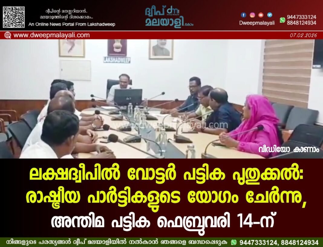 കവരത്തി: ലക്ഷദ്വീപ് ചീഫ് ഇലക്ടറൽ ഓഫീസറുടെ കീഴിൽ പുരോഗമിച്ചുവരുന്ന പ്രത്യേക വോട്ടർ പട്ടിക പുതുക്കൽ (Special Intensive Revision – SIR) പ്രവർത്തനങ്ങളുടെ പുരോഗതി വിലയിരുത്തുന്നതിനും പരാതികൾ ബോധിപ്പിക്കുന്നതിനുമായി വിവിധ രാഷ്ട്രീയ പാർട്ടികളുടെ പ്രത്യേക യോഗം ചേർന്നു. കവരത്തി സെക്രട്ടറിയേറ്റ് കോൺഫറൻസ് ഹാളിൽ നടന്ന യോഗത്തിൽ ഇലക്ഷൻ ഒബ്സർവർ സോമശേഖര അപ്പാറാവു കോട്ടാർ അധ്യക്ഷത വഹിച്ചു. കോൺഗ്രസ്, എൻ.സി.പി (ശരദ് പവാർ), ബി.ജെ.പി, സി.പി.ഐ.എം, എൻ.സി.പി, ജെ.ഡി.യു, ലോക് ജനശക്തി പാർട്ടി തുടങ്ങിയ രാഷ്ട്രീയ പാർട്ടികളുടെ പ്രതിനിധികൾ യോഗത്തിൽ പങ്കെടുത്തു.