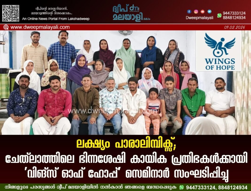 ചേത്ലാത്ത്: ദ്വീപിലെ ഭിന്നശേഷിക്കാരായ കായിക പ്രതിഭകളെ മുഖ്യധാരയിലേക്ക് കൊണ്ടുവരുന്നതിനും അവർക്ക് പാരാലിമ്പിക്സ് പോലുള്ള ഉന്നത കായിക വേദികളിൽ അവസരമൊരുക്കുന്നതിനുമായി ‘വിങ്സ് ഓഫ് ഹോപ്പ്’ ഫൗണ്ടേഷന്റെ ആഭിമുഖ്യത്തിൽ പ്രത്യേക സെമിനാർ സംഘടിപ്പിച്ചു. മുനവ്വറുൽ ഇസ്ലാം മദ്രസ്സയിൽ വെച്ച് നടന്ന പരിപാടിയിൽ, സ്പോർട്സ് ആൻഡ് യൂത്ത് അഫയേഴ്സ് വകുപ്പ് നടത്തുന്ന സെലക്ഷൻ ട്രയൽസുകളെക്കുറിച്ചും കായികരംഗത്തെ വിവിധ സാധ്യതകളെക്കുറിച്ചും താരങ്ങൾക്ക് കൃത്യമായ അവബോധം നൽകി. പരിമിതികളെ കായികക്കരുത്ത് കൊണ്ട് മറികടന്ന് എങ്ങനെ അന്താരാഷ്ട്ര നേട്ടങ്ങൾ സ്വന്തമാക്കാം എന്ന വിഷയത്തിൽ ഫൗണ്ടേഷൻ സ്ഥാപക ഫാത്തിമ ഖുറൈശാ മുഖ്യപ്രഭാഷണം നടത്തി.