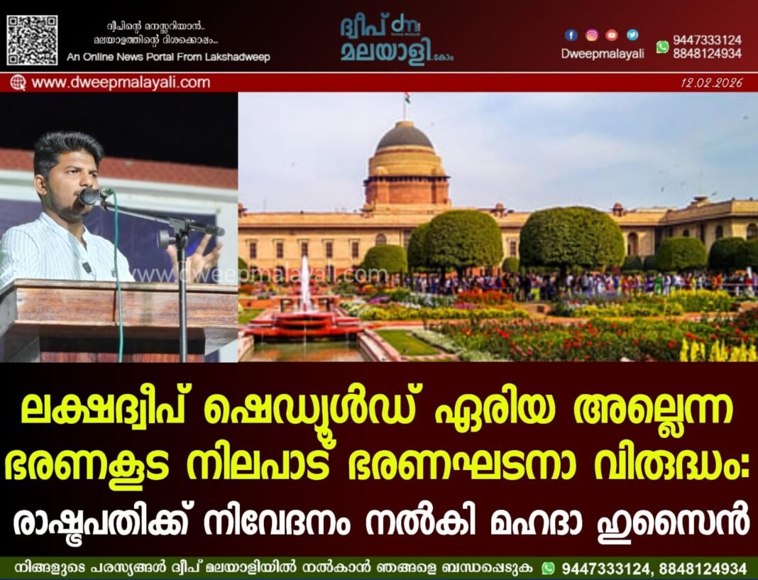 കിൽത്താൻ: ഭൂമി ഏറ്റെടുക്കാനുള്ള ലക്ഷദ്വീപ് അഡ്മിനിസ്ട്രേഷന്റെ നടപടികൾക്കെതിരെയും, ലക്ഷദ്വീപ് ഒരു ഷെഡ്യൂൾഡ് ഏരിയ (Scheduled Area) അല്ലെന്ന ഭരണകൂടത്തിന്റെ നിലപാടിനെതിരെയും സാമൂഹിക-രാഷ്ട്രീയ പ്രവർത്തകനായ മഹദാ ഹുസൈൻ ടി.ഐ. രാഷ്ട്രപതിക്ക് അടിയന്തര ഭരണഘടനാ നിവേദനം സമർപ്പിച്ചു. ലക്ഷദ്വീപ് ഭരണകൂടം ബിത്ര ദ്വീപ് മുഴുവനായി ഏറ്റെടുക്കാൻ നീക്കം നടത്തുന്ന സാഹചര്യത്തിലാണ് ഈ നിർണ്ണായക ഇടപെടൽ. ഭരണകൂടത്തിന്റെ ഈ നടപടികൾ ഇന്ത്യയുടെ ഭരണഘടനയ്ക്കും സുപ്രീം കോടതി വിധികളിലൂടെ സ്ഥിരീകരിക്കപ്പെട്ട തത്വങ്ങൾക്കും വിരുദ്ധമാണെന്ന് അദ്ദേഹം പരാതിയിൽ ചൂണ്ടിക്കാട്ടുന്നു.