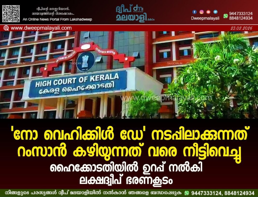 കൊച്ചി: ലക്ഷദ്വീപിൽ നടപ്പിലാക്കാൻ തീരുമാനിച്ചിരുന്ന “നോ വെഹിക്കിൾ ഡേ” (വാഹനരഹിത ദിനം) സംബന്ധിച്ച ഉത്തരവ് റംസാൻ മാസം അവസാനിക്കുന്നത് വരെ നടപ്പിലാക്കില്ലെന്ന് ലക്ഷദ്വീപ് ഭരണകൂടം അറിയിച്ചു. ഇതുമായി ബന്ധപ്പെട്ട കേസ് പരിഗണിക്കവെ കേരള ഹൈക്കോടതിയിലാണ് ഭരണകൂടത്തിന്റെ അഭിഭാഷകൻ ഈ ഉറപ്പ് നൽകിയത്. ഭരണകൂടം നൽകിയ ഈ സത്യവാങ്മൂലം കോടതി രേഖപ്പെടുത്തിയിട്ടുണ്ട്. വിഷയത്തിൽ കൂടുതൽ വാദം കേൾക്കുന്നതിനായി കേസ് 2026 മാർച്ച് 16-ലേക്ക് മാറ്റിയിരിക്കുകയാണ്. അതുവരെ വാഹന നിയന്ത്രണ ഉത്തരവ് നടപ്പിലാക്കില്ല എന്നത് ദ്വീപ് നിവാസികൾക്ക് താൽക്കാലിക ആശ്വാസമാകും.