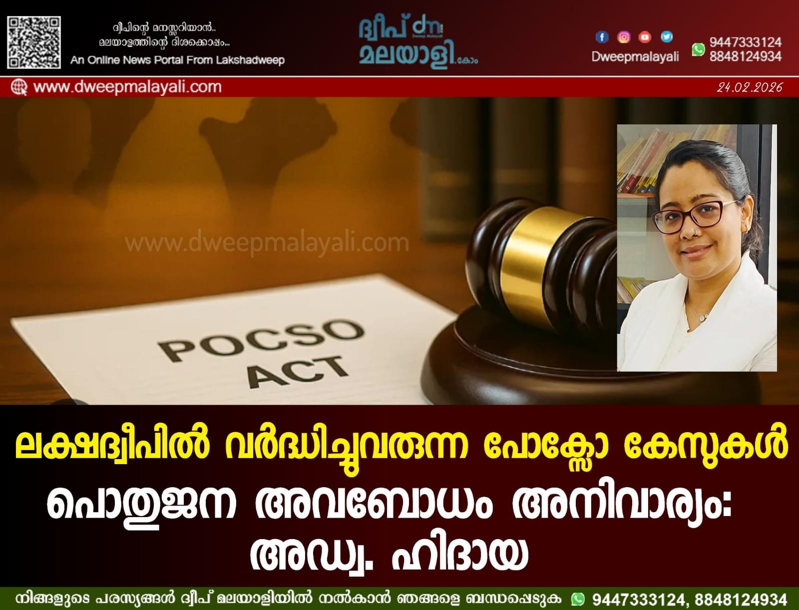 കവരത്തി: ലക്ഷദ്വീപിൽ വർദ്ധിച്ചുവരുന്ന പോക്സോ (POCSO) കേസുകളുടെ പശ്ചാത്തലത്തിൽ പൊതുജന അവബോധം ശക്തമാക്കേണ്ടത് അനിവാര്യമാണെന്ന് ലക്ഷദ്വീപ് ബാർ അസോസിയേഷൻ പ്രസിഡന്റ് അഡ്വ. ഹിദായ ചേര്യന്നല്ലാൽ. ഇത്തരം കേസുകളിൽ പ്രതികൾ അറസ്റ്റ് ചെയ്യപ്പെടുന്നതും ജാമ്യത്തിൽ ഇറങ്ങുന്നതും പലപ്പോഴും വാർത്തയാകാറുണ്ടെങ്കിലും, വിചാരണയ്ക്ക് ശേഷം കോടതി വിധിക്കുന്ന കഠിനമായ ശിക്ഷകളെക്കുറിച്ചും അവയുണ്ടാക്കുന്ന സാമൂഹിക പ്രത്യാഘാതങ്ങളെക്കുറിച്ചും പൊതുസമൂഹം വേണ്ടത്ര ബോധവാന്മാരല്ലെന്ന് അദ്ദേഹം ചൂണ്ടിക്കാട്ടുന്നു. പോക്സോ കേസുകളിൽ ഇരകളായ കുട്ടികളുടെ മൊഴിക്ക് നിയമപരമായി വലിയ പ്രാധാന്യമുണ്ടെന്നും, മറ്റ് സാഹചര്യങ്ങൾ അനുകൂലമായാലും കുട്ടിയുടെ മൊഴി വിശ്വസനീയമാണെങ്കിൽ പ്രതിക്ക് കനത്ത ശിക്ഷ ലഭിക്കുമെന്നും യുവാക്കൾ തിരിച്ചറിയണം. ദീർഘകാല ജയിൽവാസം പ്രതിയുടെ ജീവിതത്തെ മാത്രമല്ല, അവരുടെ കുടുംബത്തെയും മക്കളെയും വലിയ രീതിയിലുള്ള സാമൂഹിക ഒറ്റപ്പെടലിലേക്കും പ്രതിസന്ധികളിലേക്കും തള്ളിവിടുമെന്ന ഗൗരവകരമായ യാഥാർത്ഥ്യം സമൂഹം ഉൾക്കൊള്ളേണ്ടതുണ്ട്.