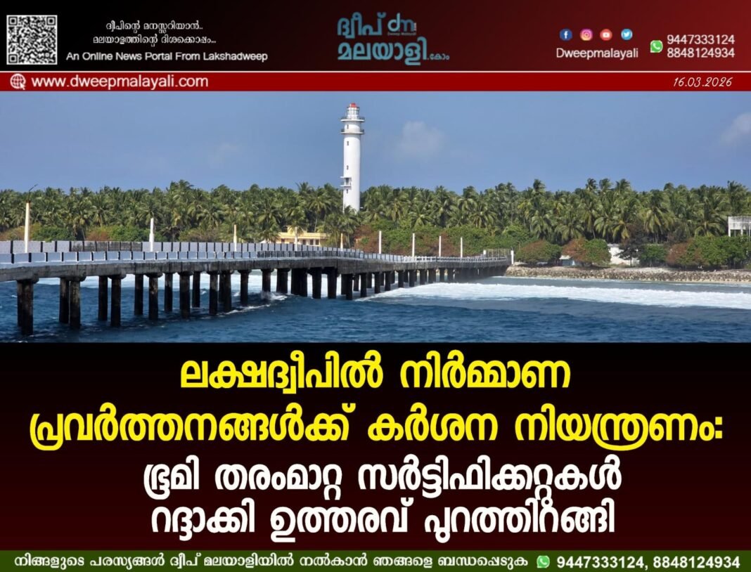 കവരത്തി: ലക്ഷദ്വീപ് ഭരണകൂടം ദ്വീപുകളിലെ നിർമ്മാണ പ്രവർത്തനങ്ങൾക്ക് കർശന നിയന്ത്രണം ഏർപ്പെടുത്തിക്കൊണ്ട് പുതിയ ഉത്തരവ് പുറത്തിറക്കി. ലക്ഷദ്വീപ് ടൗൺ ആൻഡ് കൺട്രി പ്ലാനിംഗ് റെഗുലേഷന്റെ ഭാഗമായി ദ്വീപുകളുടെ സമഗ്രവും സുസ്ഥിരവുമായ വികസനം ലക്ഷ്യമിട്ടാണ് ഈ സുപ്രധാന നടപടി. സ്വകാര്യ ഭൂമിയിലും പണ്ടാരം ഭൂമിയിലും നിർമ്മാണ ആവശ്യങ്ങൾക്കായി നേരത്തെ അനുവദിച്ചിരുന്ന എല്ലാ ഭൂമി തരംമാറ്റ (Diversion Certificates) സർട്ടിഫിക്കറ്റുകളും ഉടനടി പ്രാബല്യത്തോടെ റദ്ദാക്കിയതായി കവരത്തി കളക്ടറേറ്റിൽ നിന്ന് പുറത്തിറക്കിയ ഉത്തരവിൽ വ്യക്തമാക്കുന്നു. അഡീഷണൽ ഡിസ്ട്രിക്റ്റ് മജിസ്ട്രേറ്റ് ശിവം ചന്ദ്ര ഐ.എ.എസ് ആണ് ഈ ഉത്തരവ് പുറപ്പെടുവിച്ചത്.