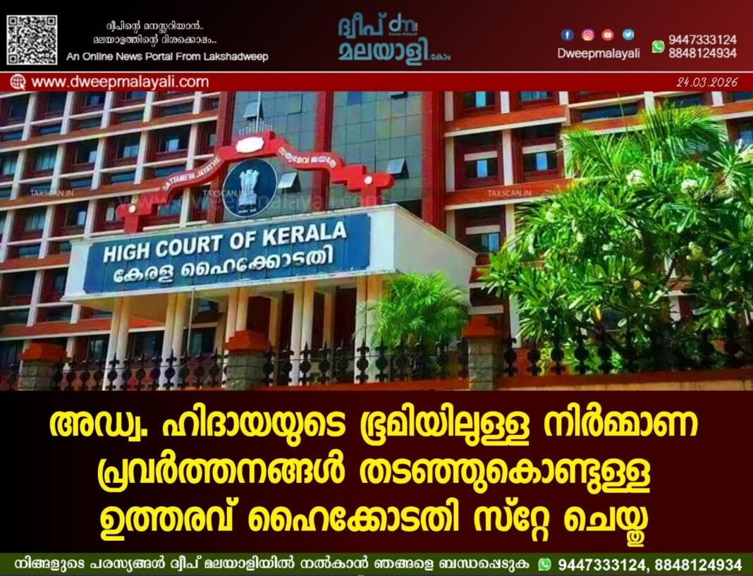 കൊച്ചി: കൽപേനി ദ്വീപ് സ്വദേശിനിയായ സി. എൻ. നൂറുൽ ഹിദായ സമർപ്പിച്ച റിട്ട് ഹർജിയിൽ ലക്ഷദ്വീപ് ഭരണകൂടത്തിന്റെ ഉത്തരവ് കേരള ഹൈക്കോടതി താൽക്കാലികമായി സ്റ്റേ ചെയ്തു. ജസ്റ്റിസ് മുരളി പുരുഷോത്തമൻ അധ്യക്ഷനായ ബെഞ്ചാണ് ഈ ഇടക്കാല ഉത്തരവ് പുറപ്പെടുവിച്ചത്. ഹർജിക്കാരിയുടെ വസ്തുവുമായി ബന്ധപ്പെട്ട് അഡീഷണൽ ഡിസ്ട്രിക്റ്റ് മജിസ്ട്രേറ്റ് പുറപ്പെടുവിച്ച എക്സിബിറ്റ് പി-4 (Exhibit P-4) എന്ന ഉത്തരവിനാണ് രണ്ട് മാസത്തെ സ്റ്റേ അനുവദിച്ചിരിക്കുന്നത്.