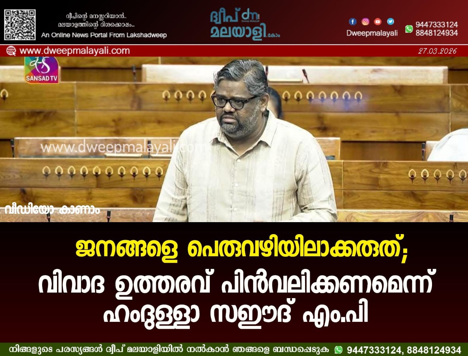ന്യൂഡൽഹി: ലക്ഷദ്വീപിലെ പണ്ടാരം, പ്രൈവറ്റ് ഭൂമികളുമായി ബന്ധപ്പെട്ട ഡൈവേർഷൻ സർട്ടിഫിക്കറ്റുകൾ റദ്ദാക്കിയ ഭരണകൂട നടപടിക്കെതിരെ പാർലമെന്റിൽ ശക്തമായ പ്രതിഷേധം രേഖപ്പെടുത്തി ലക്ഷദ്വീപ് എം.പി അഡ്വ. ഹംദുള്ള സഈദ്. 2026 മാർച്ച് 14-ന് പുറപ്പെടുവിച്ച വിവാദ ഉത്തരവ് ദ്വീപ് നിവാസികളെ കടുത്ത പ്രതിസന്ധിയിലാക്കിയിരിക്കുകയാണെന്ന് അദ്ദേഹം ലോക്സഭയിൽ ചൂണ്ടിക്കാട്ടി. കൃത്യമായ പരിശോധനകൾക്ക് ശേഷം ബന്ധപ്പെട്ട അധികാരികൾ നൽകിയ സർട്ടിഫിക്കറ്റുകളുടെ അടിസ്ഥാനത്തിലാണ് പല കുടുംബങ്ങളും തങ്ങളുടെ ജീവിതസമ്പാദ്യം ഉപയോഗിച്ച് വീടുകളും മറ്റും നിർമ്മിച്ചത്. എന്നാൽ യാതൊരു മുന്നറിയിപ്പുമില്ലാതെ ഈ അനുമതികൾ റദ്ദാക്കിയത് ജനങ്ങളിൽ വലിയ തോതിലുള്ള അനിശ്ചിതത്വത്തിനും ആശങ്കയ്ക്കും കാരണമായിരിക്കുകയാണ്.