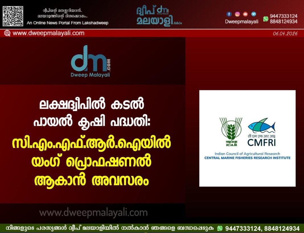 കവരത്തി: ലക്ഷദ്വീപിലെ കടൽ പായൽ കൃഷി വ്യാപിപ്പിക്കുന്നതിനായി കേന്ദ്ര സമുദ്ര മത്സ്യ ഗവേഷണ സ്ഥാപനം (ICAR-CMFRI) കവരത്തി ഫീൽഡ് ലബോറട്ടറിയിൽ യംഗ് പ്രൊഫഷണൽ-I തസ്തികയിലേക്ക് അപേക്ഷ ക്ഷണിച്ചു. നബാർഡ് ധനസഹായം നൽകുന്ന “കടൽ പായൽ കൃഷി സാങ്കേതിക കൈമാറ്റത്തിലൂടെയും പ്രദർശനത്തിലൂടെയും ലക്ഷദ്വീപിൽ മെച്ചപ്പെടുത്തുക” എന്ന പ്രോജക്റ്റിലേക്കാണ് ഈ നിയമനം നടക്കുന്നത്. രണ്ട് വർഷത്തേക്കോ അല്ലെങ്കിൽ പ്രോജക്റ്റ് അവസാനിക്കുന്നത് വരെയോ ആയിരിക്കും ഈ താൽക്കാലിക നിയമനത്തിന്റെ കാലാവധി.