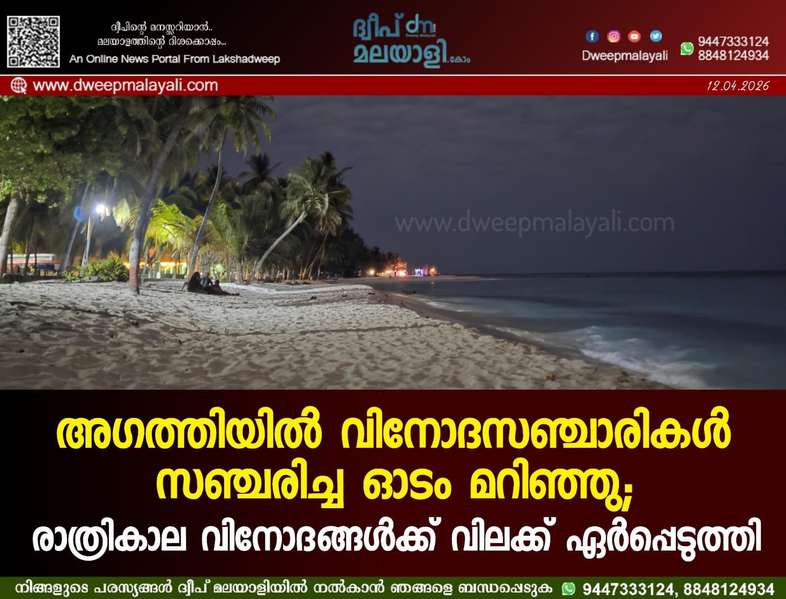 ​ഈ സാഹചര്യത്തിൽ വിനോദസഞ്ചാരികളുടെ സുരക്ഷ കണക്കിലെടുത്ത് അഗത്തി പോലീസ് പരിധിയിലുള്ള കടൽ പ്രദേശങ്ങളിൽ രാത്രികാല വിനോദപരിപാടികൾക്ക് താൽക്കാലിക നിരോധനം ഏർപ്പെടുത്തി. വിനോദസഞ്ചാരത്തിനായി ഉപയോഗിക്കുന്ന ബോട്ടുകളുടെയും ഓടങ്ങളുടെയും സുരക്ഷാ നിലവാരം പുനഃപരിശോധിക്കുമെന്നും നിയമലംഘനം നടത്തുന്നവർക്കെതിരെ കർശന നടപടി സ്വീകരിക്കുമെന്നും അധികൃതർ വ്യക്തമാക്കിയിട്ടുണ്ട്. ടൂറിസം മേഖലയിൽ സുരക്ഷാ സംവിധാനങ്ങൾ കൂടുതൽ കാര്യക്ഷമമാക്കണമെന്ന് നാട്ടുകാർ ആവശ്യപ്പെട്ടു. അടുത്ത അറിയിപ്പ് ഉണ്ടാകുന്നത് വരെ നിയന്ത്രണങ്ങൾ തുടരുമെന്നാണ് പോലീസ് നൽകുന്ന ഔദ്യോഗിക വിവരം.