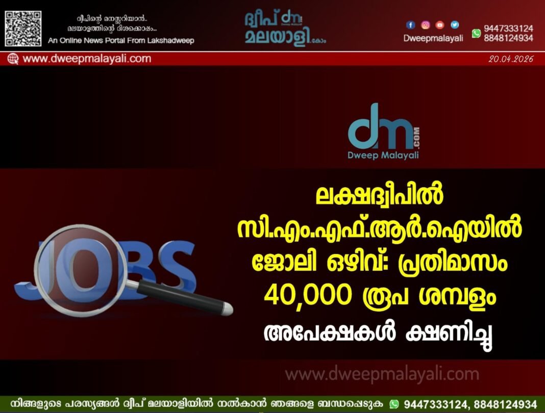 കവരത്തി: ​കേന്ദ്ര സമുദ്രമത്സ്യ ഗവേഷണ സ്ഥാപനത്തിന്റെ (ICAR-CMFRI) കവരത്തിയിലുള്ള ഫീൽഡ് ലബോറട്ടറിയിൽ പ്രോജക്ട് ഫെലോ തസ്തികയിലേക്ക് അപേക്ഷ ക്ഷണിച്ചു. ഭാരത സർക്കാരിന്റെ ഫിഷറീസ് മന്ത്രാലയത്തിന് കീഴിലുള്ള ‘പ്രധാനമന്ത്രി മത്സ്യ കിസാൻ സമൃദ്ധി സഹ-യോജന’ (PM-MKSSY) എന്ന പദ്ധതിയുടെ ഭാഗമായുള്ള വെരിഫിക്കേഷൻ ആൻഡ് മോണിറ്ററിംഗ് കൺസൾട്ടന്റ് വിഭാഗത്തിലാണ് ഈ ഒഴിവ് നിലവിലുള്ളത്. തിരഞ്ഞെടുക്കപ്പെടുന്നവർക്ക് പ്രതിമാസം 40,000 രൂപ നിശ്ചിത ശമ്പളമായി ലഭിക്കുന്നതാണ്. നിലവിൽ മൂന്ന് വർഷത്തേക്കോ അല്ലെങ്കിൽ പ്രോജക്ട് കാലാവധി അവസാനിക്കുന്നത് വരെയോ ഉള്ള താൽക്കാലിക നിയമനമാണിതെന്ന് അധികൃതർ അറിയിച്ചു.